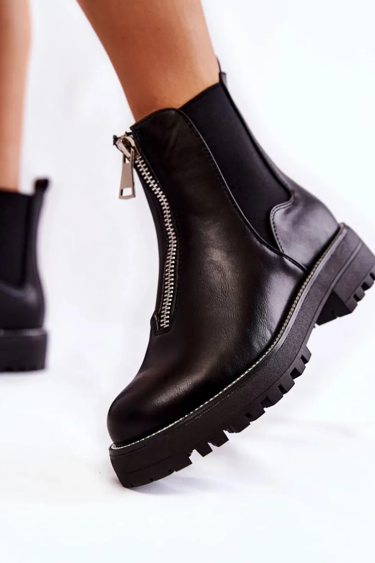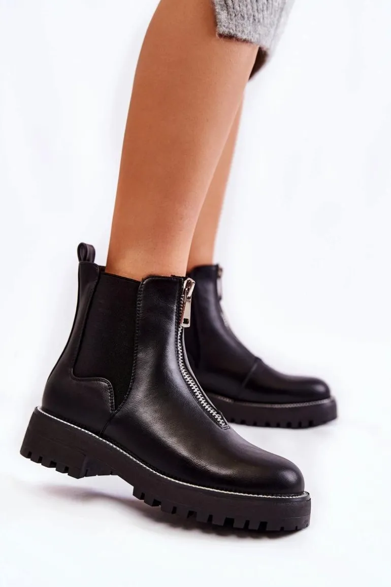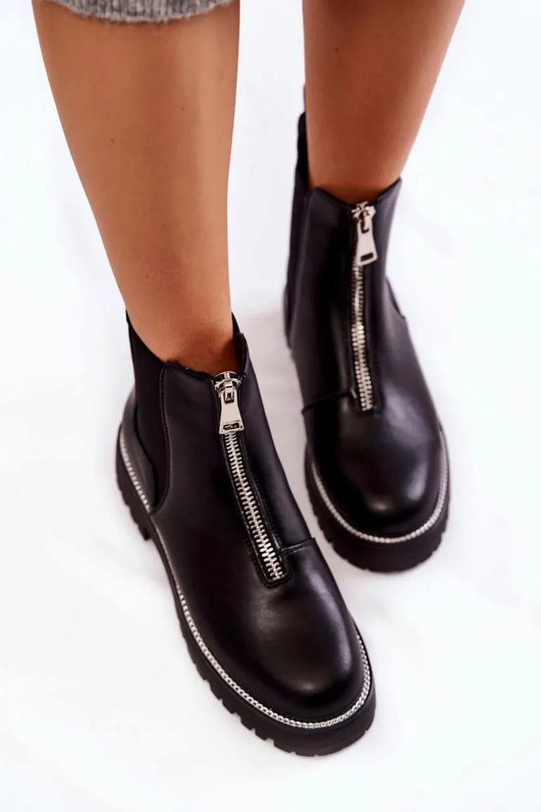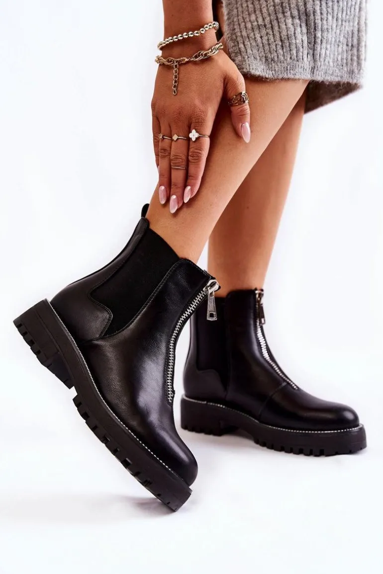 Damskie botki zostały osadzone na płaskim obcasie ze żłobieniami. Podeszwa została przyozdobiona łańcuszkiem. Botki zostały wykonane z eko skóry. Z przodu umieszczono suwak ułatwiający zakładanie obuwia. Model został ocieplony miłym w dotyku kocem obuwniczym. Zapiętek w tych sztybletach jest usztywniany. Koniecznie powinnaś je mieć! Przy wyborze rozmiaru prosimy sugerować się tabelą rozmiarów.