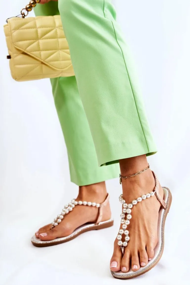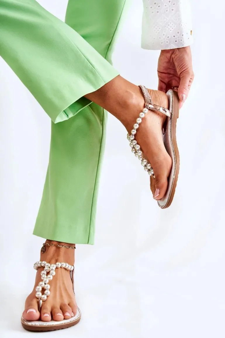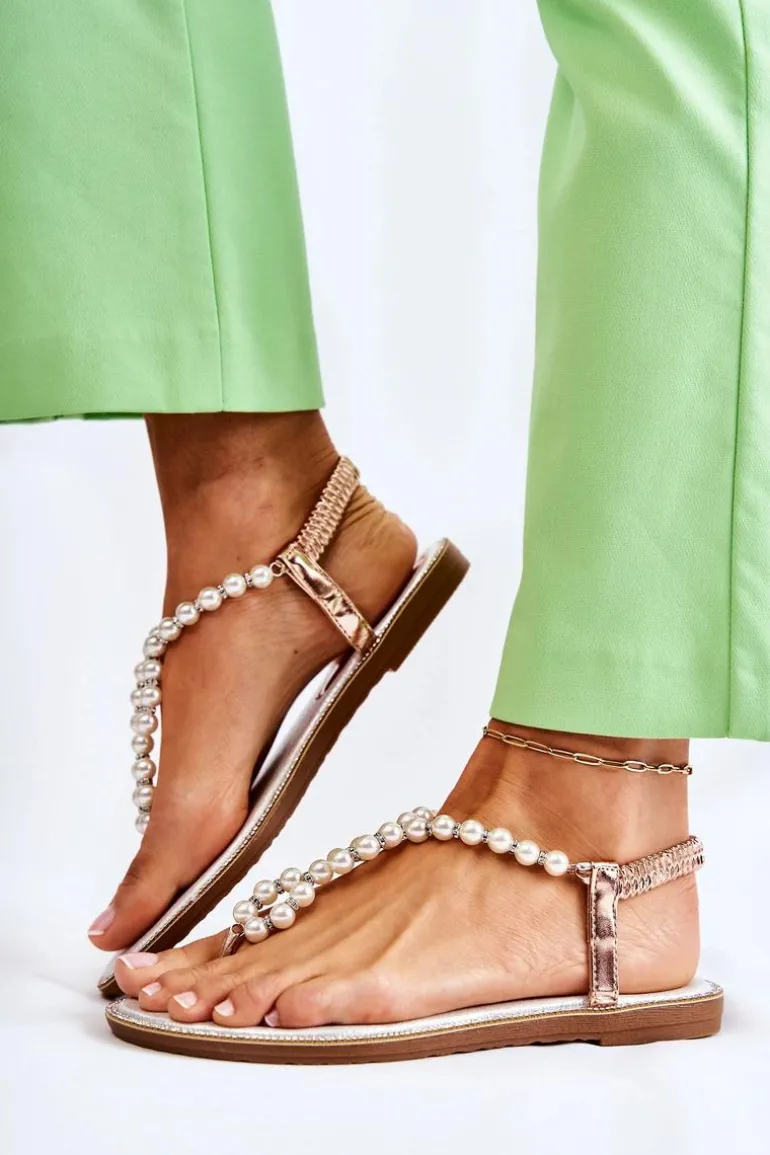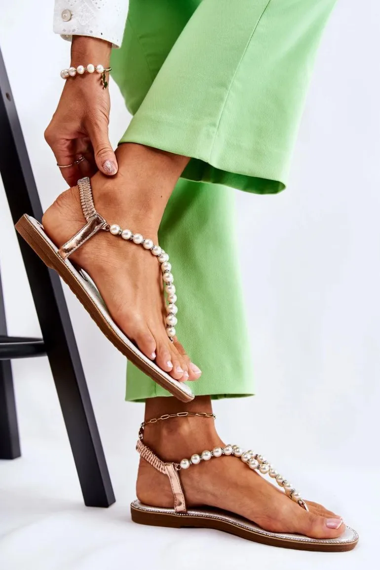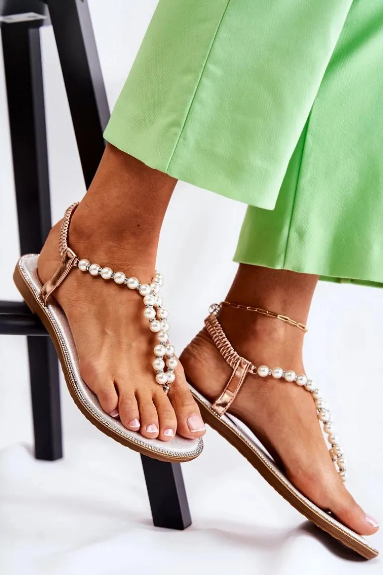 Sandały typu japonki osadzone na płaskim obcasie. Posiadają antypoślizgową, gumową podeszwę. Eko skórzany ściągacz łączy się z ozdobnymi paskami z imitacją cyrkonii i pereł. Model wsuwany. Miękka wkładka wykonana z materiału zapewni komfort podczas użytkowania. Podeszwa przyozdobiona cyrkoniami. Sandały świetnie będą prezentować się z wieloma stylizacjami! Przy wyborze rozmiaru prosimy kierować się tabelą rozmiarów.