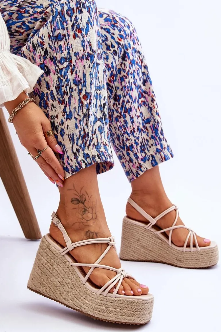 Modne Sandały Na Koturnie Z Plecionką Beżowe Nessia