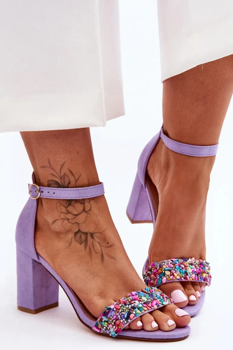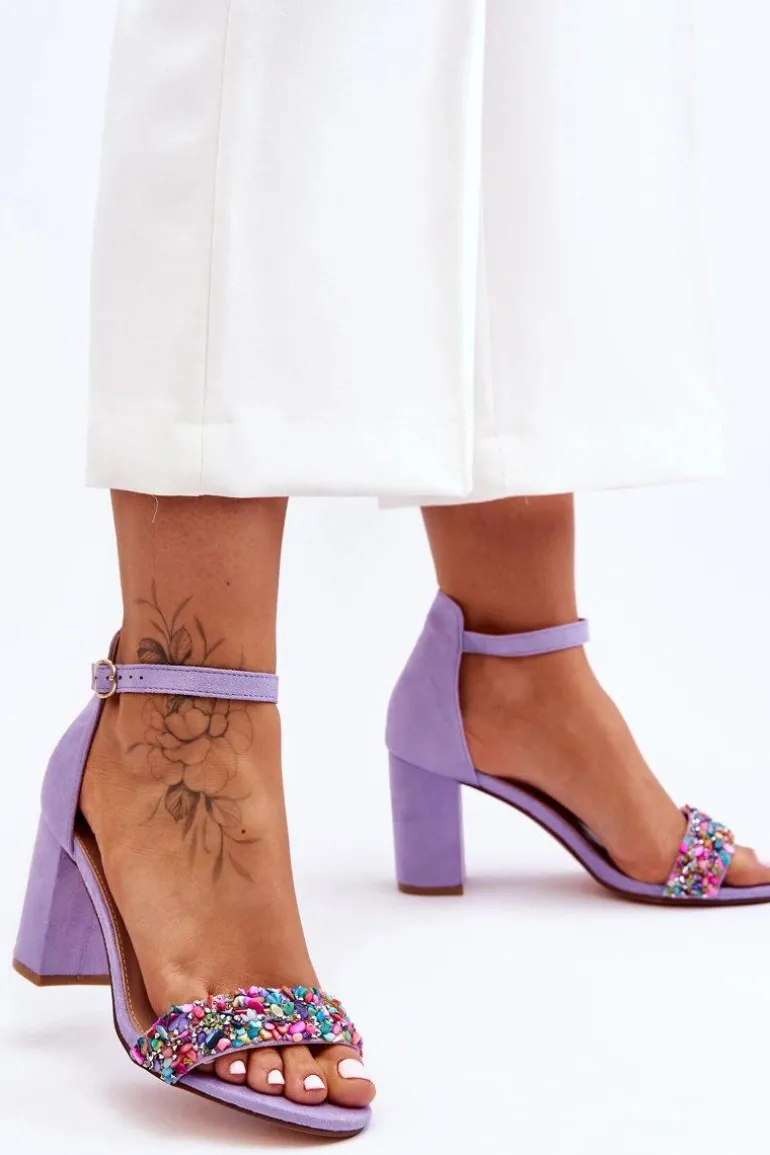 Modne sandały damskie zostały wykonane z miłego w dotyku eko zamszu. Osadzone na obcasie w postaci słupka. Paseczek na przodzie został ozdobiony modnymi kamieniami, co dodaje tym butom elegancji. Miękka wkładka z eko skóry zadba o Twój komfort podczas użytkowania. Model ten świetnie sprawdzi się na różnego rodzaju ważnych uroczystościach czy spotkaniach biznesowych. Przy wyborze rozmiaru prosimy sugerować się tabelą rozmiarów.