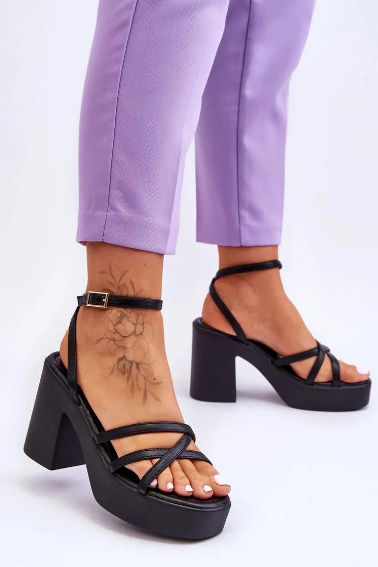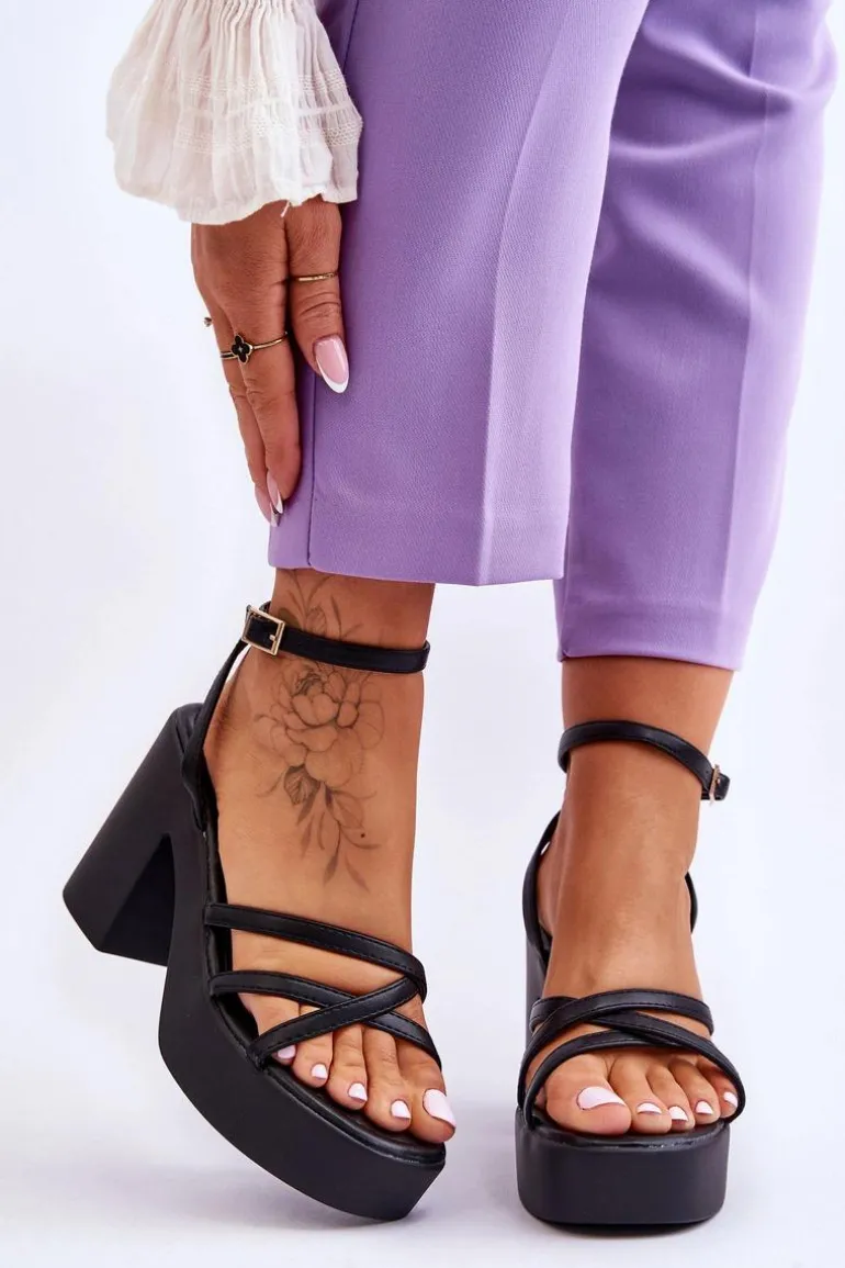 Wyjątkowe, damskie sandały zostały wykonane z eko skóry. Model ten posiada zapinanie wokół kostki na regulowany pasek ze sprzączką i jest niezwykle lekki. Sandałki osadzono na platformie oraz masywnym, szerokim słupku. Wygodna wkładka została wykonana także z eko skóry. Przy wyborze rozmiaru prosimy sugerować się tabelą rozmiarów.