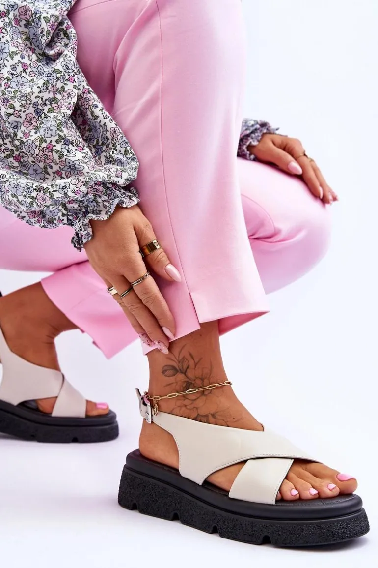 Modne sandały zostały wykonane z wysokiej jakości eko skóry. Posiadają zapinanie wokół kostki na klamrę z regulowanym paskiem. Wkładka została wykonana z miękkiej eko skóry. Sandały posiadają odkryte palce i piętę. Osadzone na masywnej platformie z tworzywa sztucznego. Te sandałki to idealny wybór na upalne dni! Przy wyborze rozmiaru prosimy sugerować się tabelą rozmiarów.