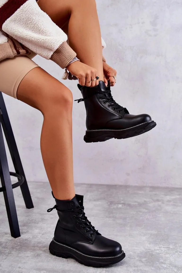 Damskie botki w stylu glanów zostały osadzone na platformie i płaskim obcasie z gumowego tworzywa. Posiadają klasyczne sznurowanie. Wyższa cholewka za kostkę została wykonana z eko skóry. Nosek zaokrąglony. Botki posiadają usztywniany zapiętek. Podeszwa obszyta nicią. Świetnie będą prezentować się z woskowanymi spodniami. Przy wyborze rozmiaru prosimy sugerować się tabelą rozmiarów.