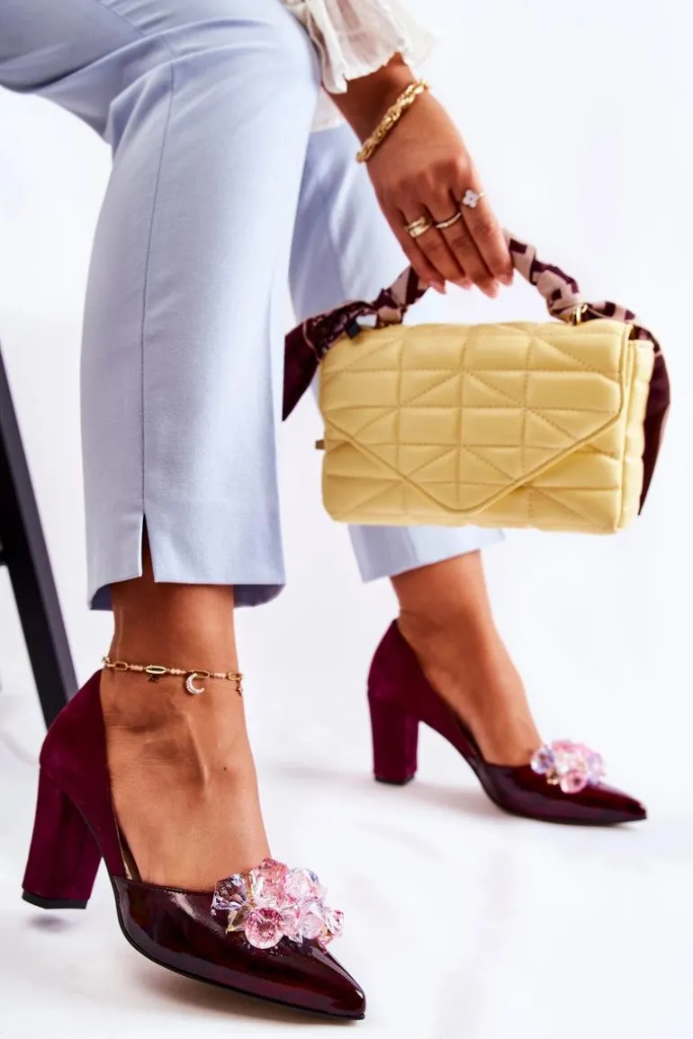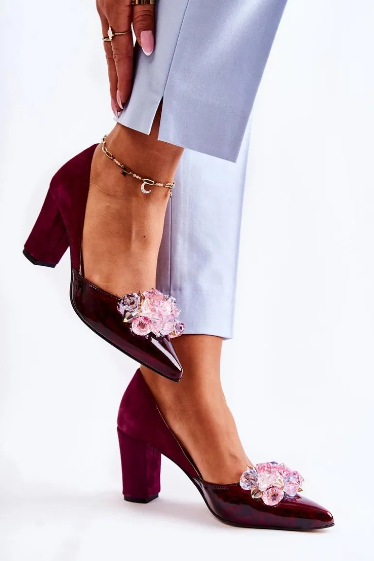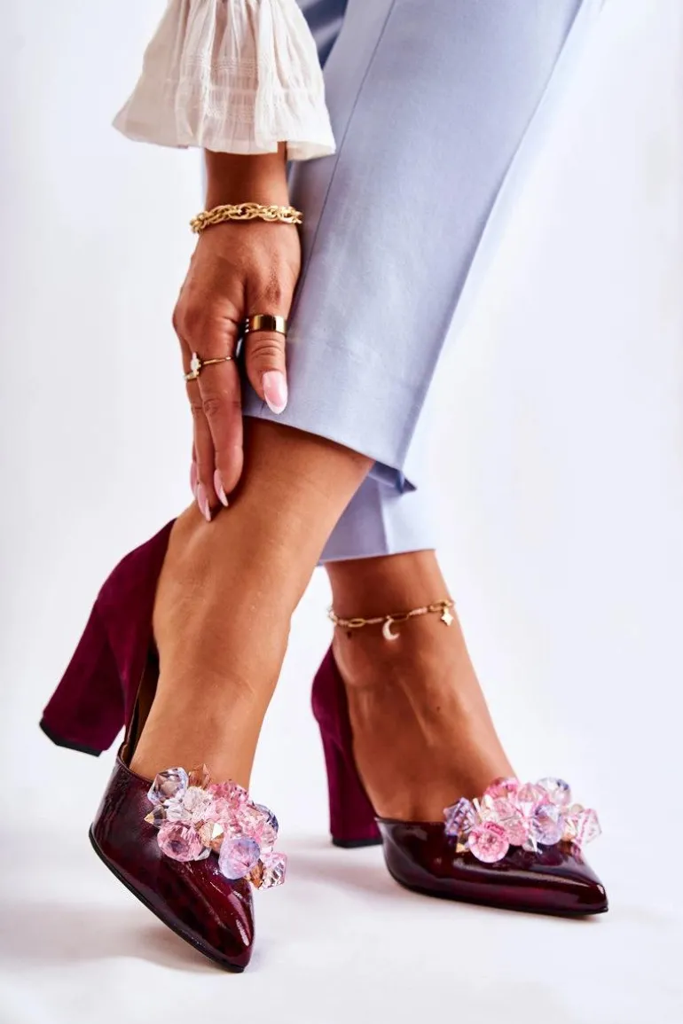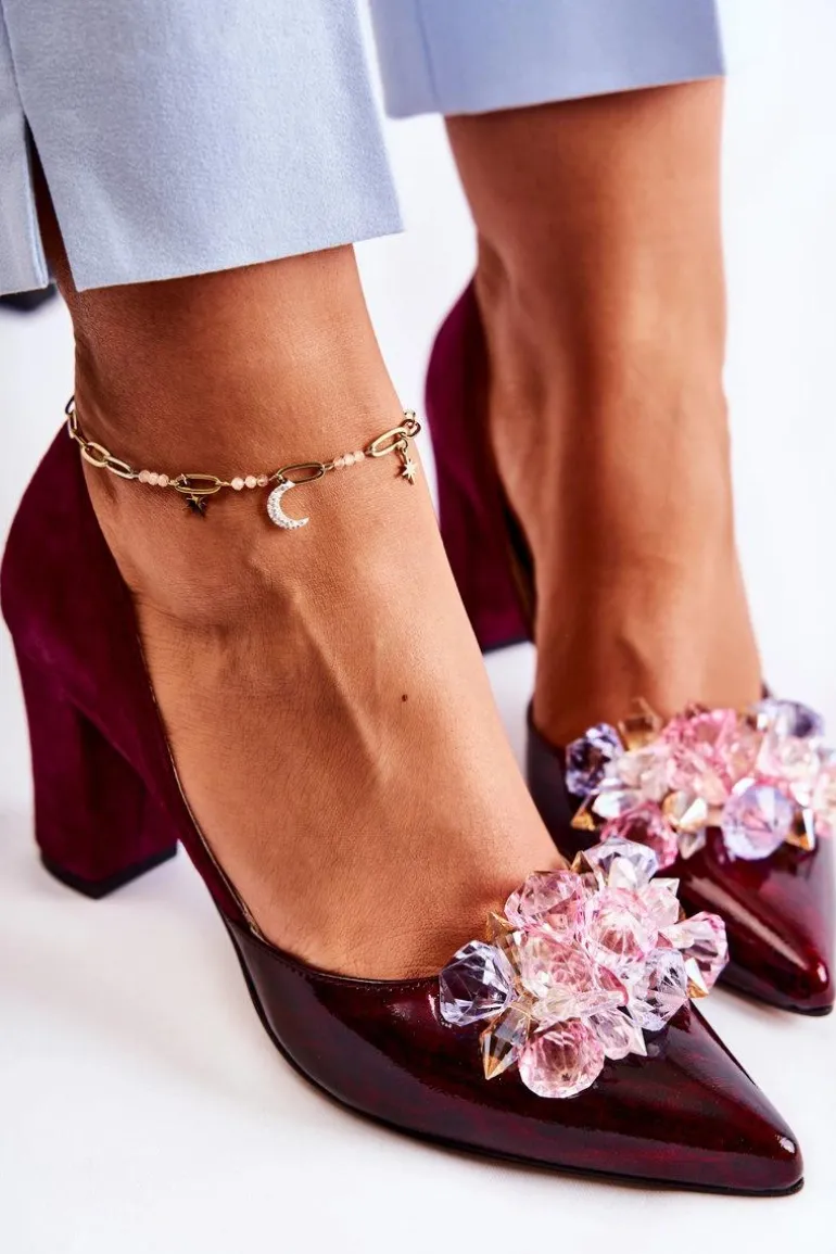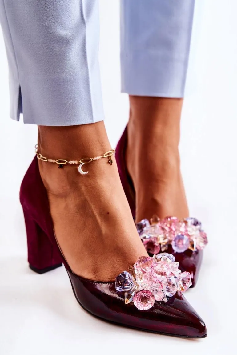 Modne Skórzane Czółenka Z Ozdobami Bordowe Louna