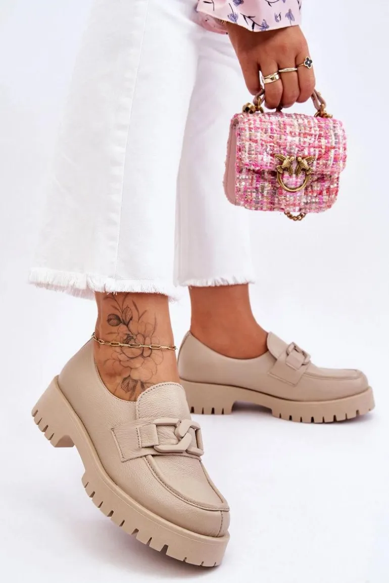 Półbuty wsuwane wykonane z naturalnej skóry z zaokrąglonym noskiem. Osadzone na masywnej platformie i płaskim, stabilnym obcasie. Model z wysokim bieżnikiem na podeszwie. Na górze dekoracyjny łańcuch. Pod językiem znajduje się elastyczna gumka ściągająca, dzięki której but będzie bardziej dopasowany do stopy. Półbuty posiadają usztywniany zapiętek. Modne, wygodne, wykonane z dbałością o szczegóły – jednym słowem: idealne! Miękka, wykonana z naturalnej skóry wkładka zadba o Twój komfort. Przy wyborze rozmiaru prosimy sugerować się tabelą rozmiarów.