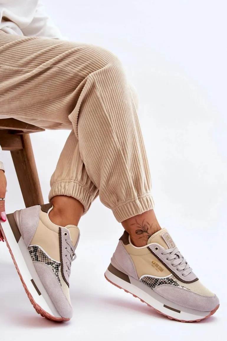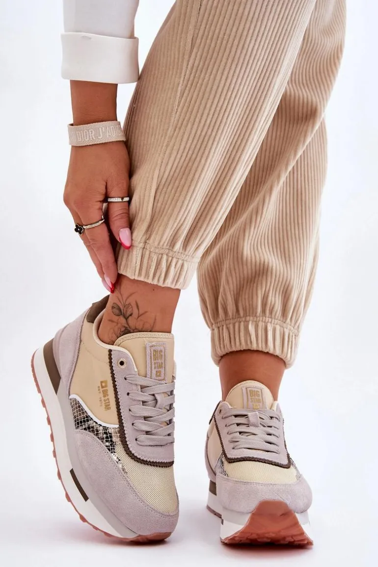 Modne sneakersy damskie od marki Big Star zostały wykonane z połączenia materiału tekstylnego oraz naturalnego zamszu. Model ten posiada klasyczne sznurowanie. Wkładka Memory Foam System zapamiętuje kształt stopy, zapewnia doskonałe dopasowanie, absorbuje wstrząsy, jest odporna na odkształcenia oraz pozwala na odparowanie wilgoci i regulację temperatury. Buty zostały osadzone na masywnej platformie z antypoślizgową podeszwą. Dodatkowo posiadają usztywniany zapiętek. Przy wyborze rozmiaru prosimy sugerować się tabelą rozmiarów.