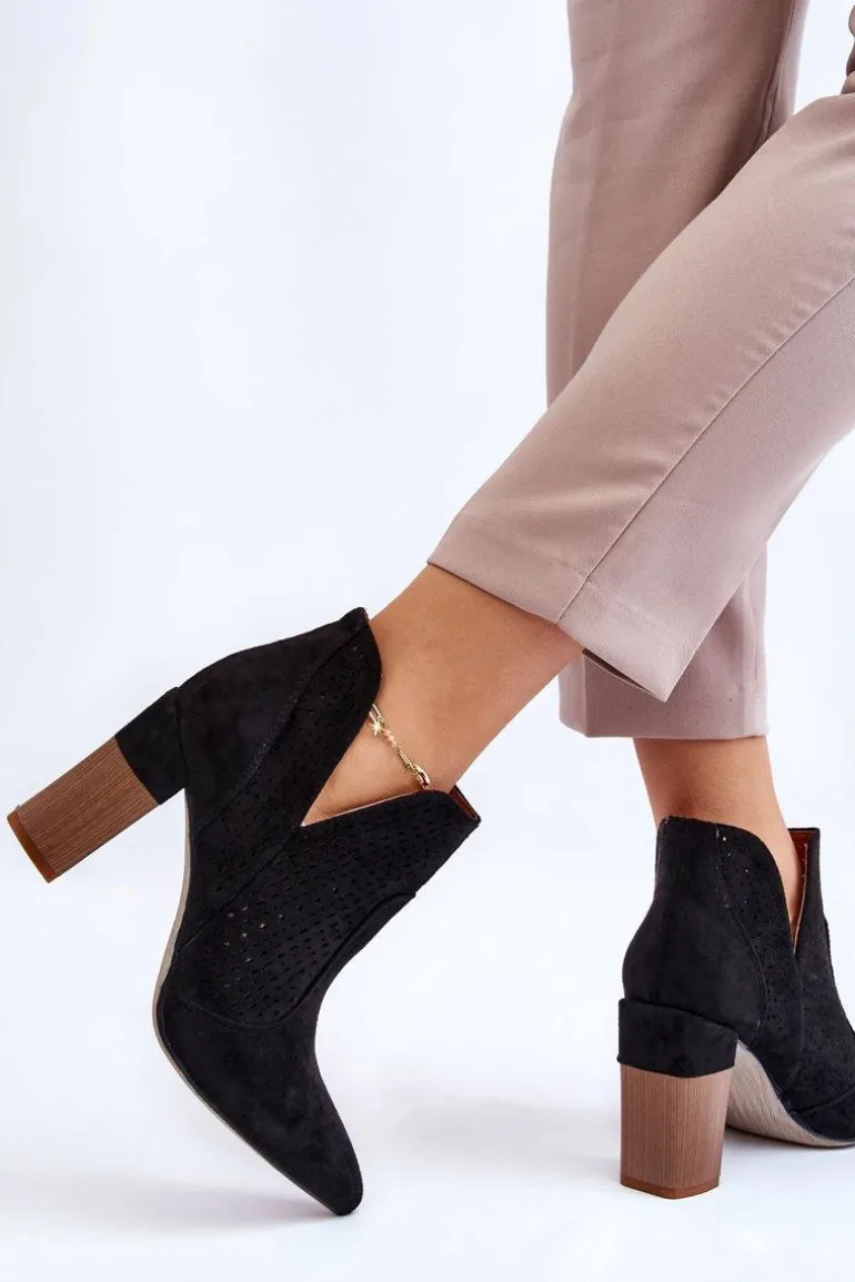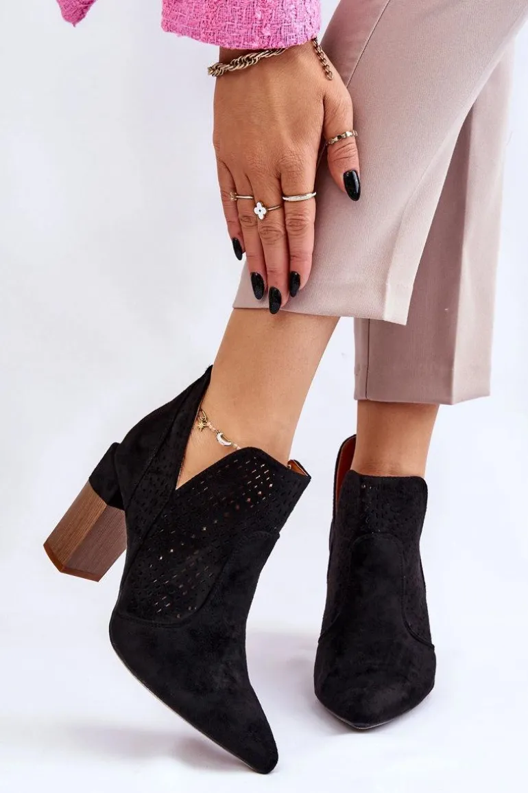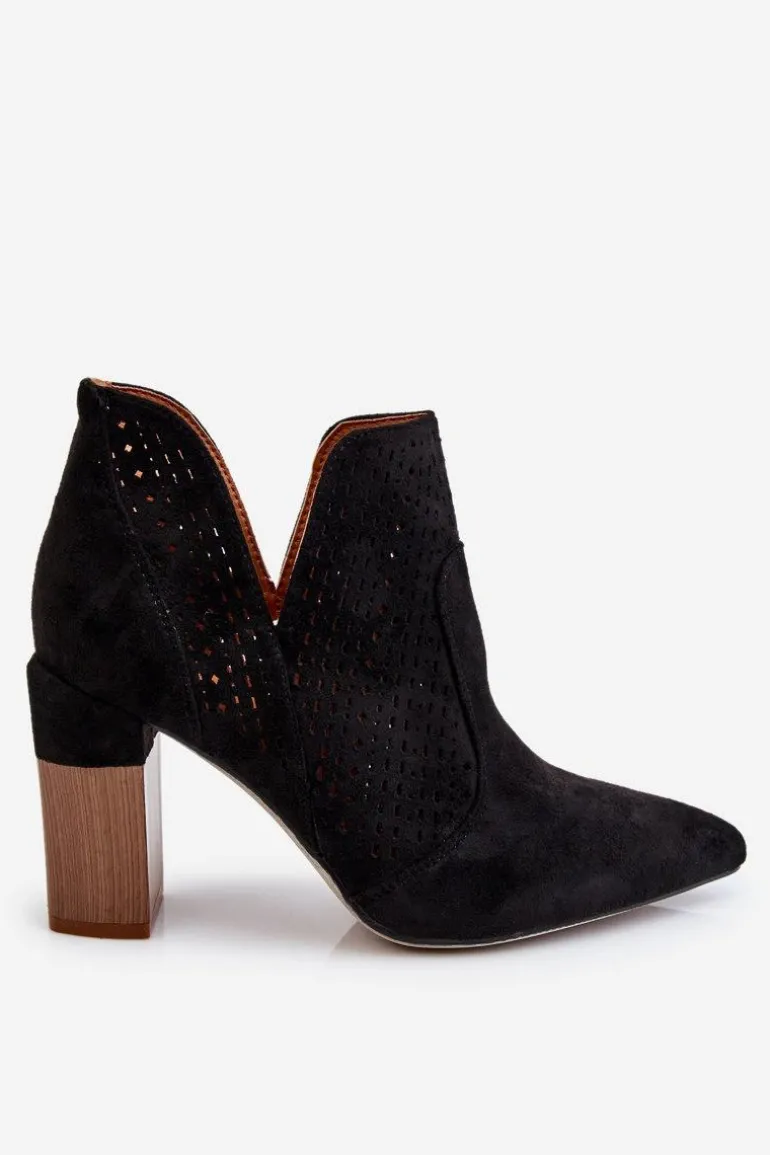 Modne Zamszowe Ażurowe Botki Na Obcasie Czarne Genevi
