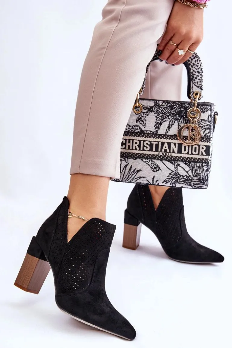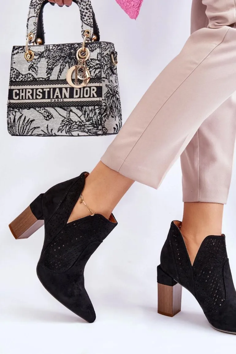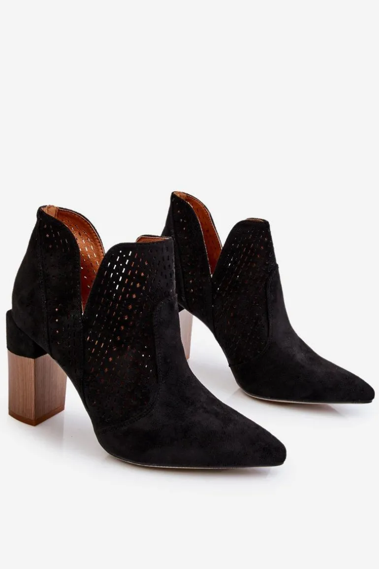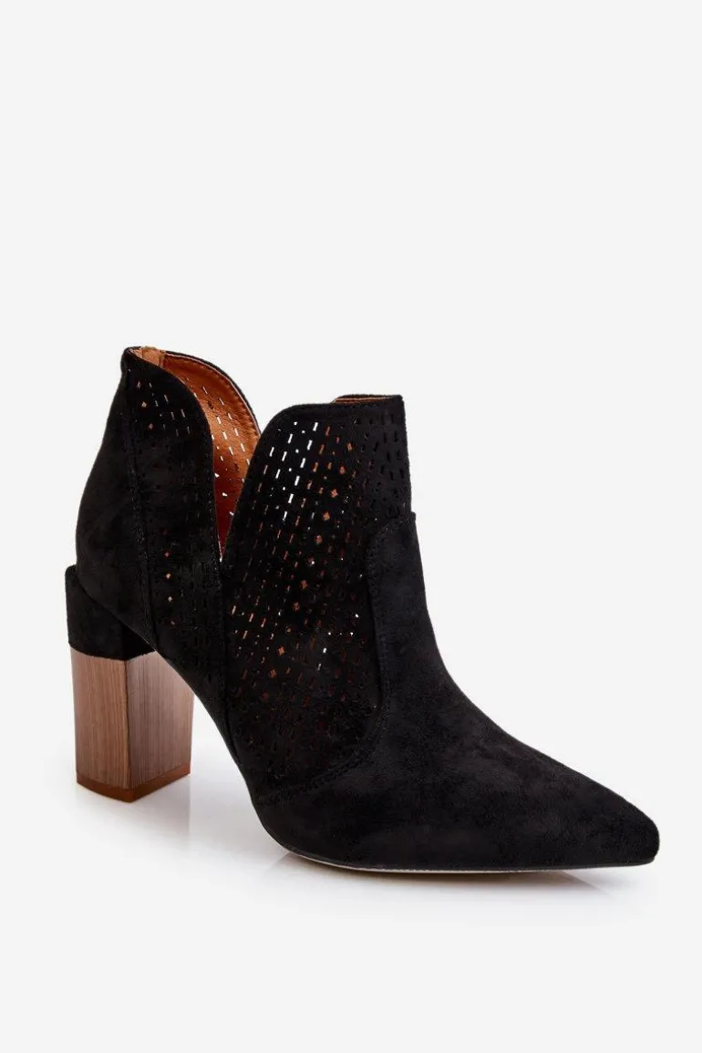 Modne Zamszowe Ażurowe Botki Na Obcasie Czarne Genevi