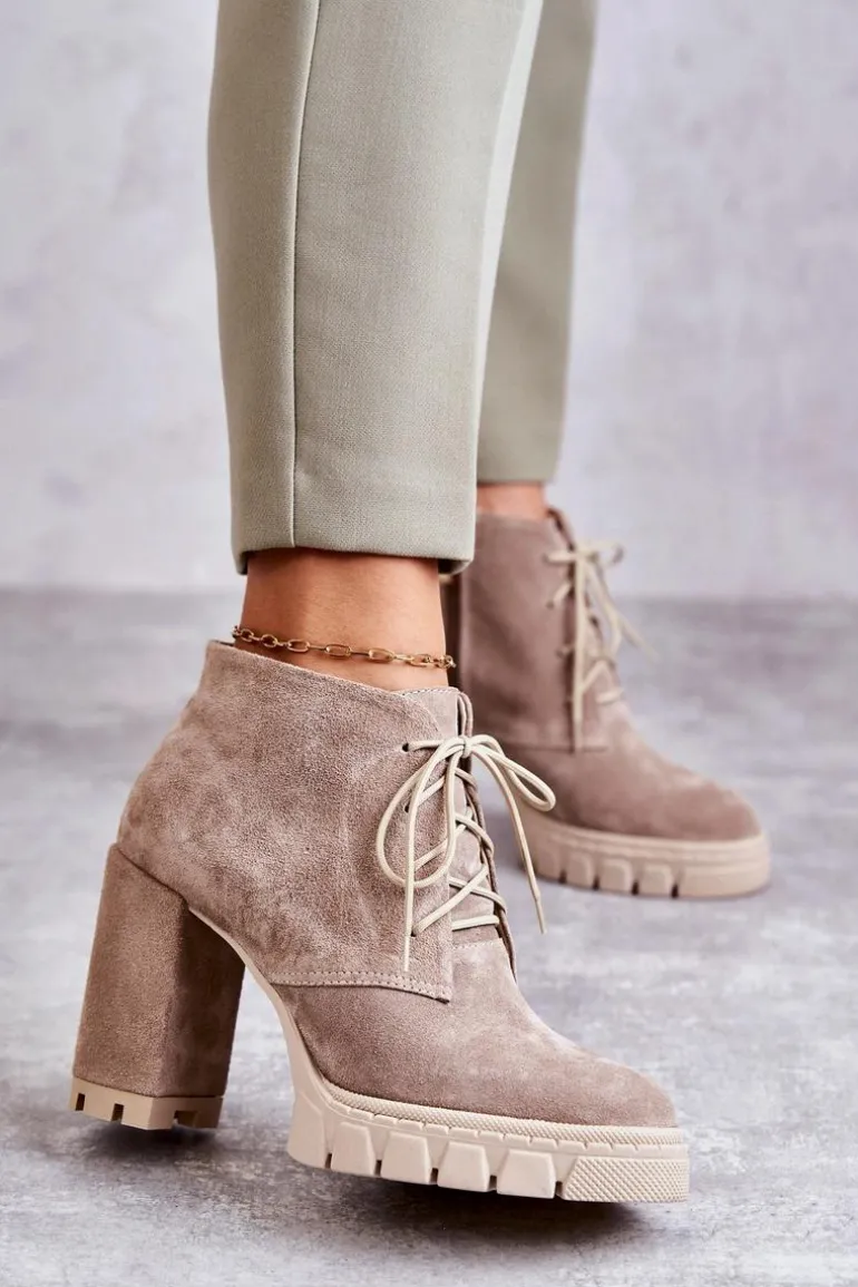 Cudowne botki damskie zostały wykonane z najwyższej jakości naturalnych skór z dbałością o szczegóły. Model ten posiada klasyczne sznurowanie oraz suwak z boku cholewki. Dodatkowo zapiętek w tych botkach jest usztywniany. Osadzono je na obcasie w postaci słupka oraz platformie. Miękka wkładka wykonana z naturalnej skóry zapewni komfort podczas użytkowania. Przy wyborze rozmiaru prosimy sugerować się tabelą rozmiarów.