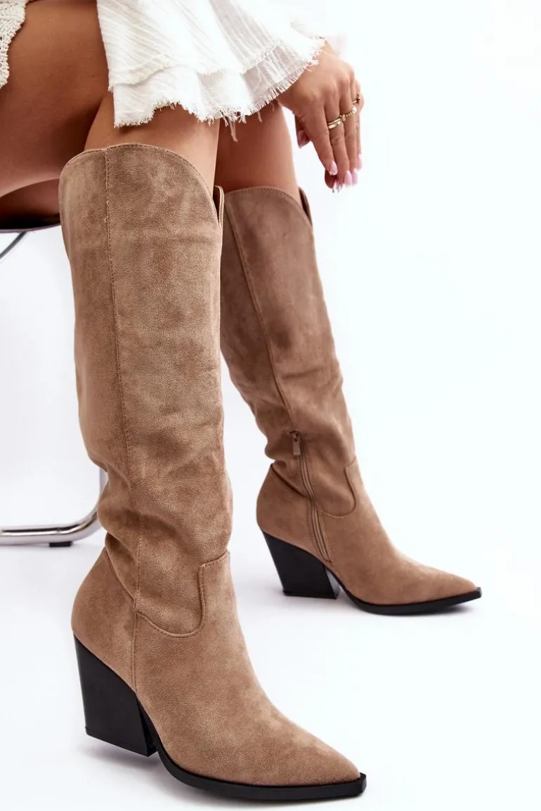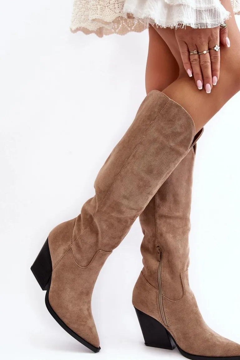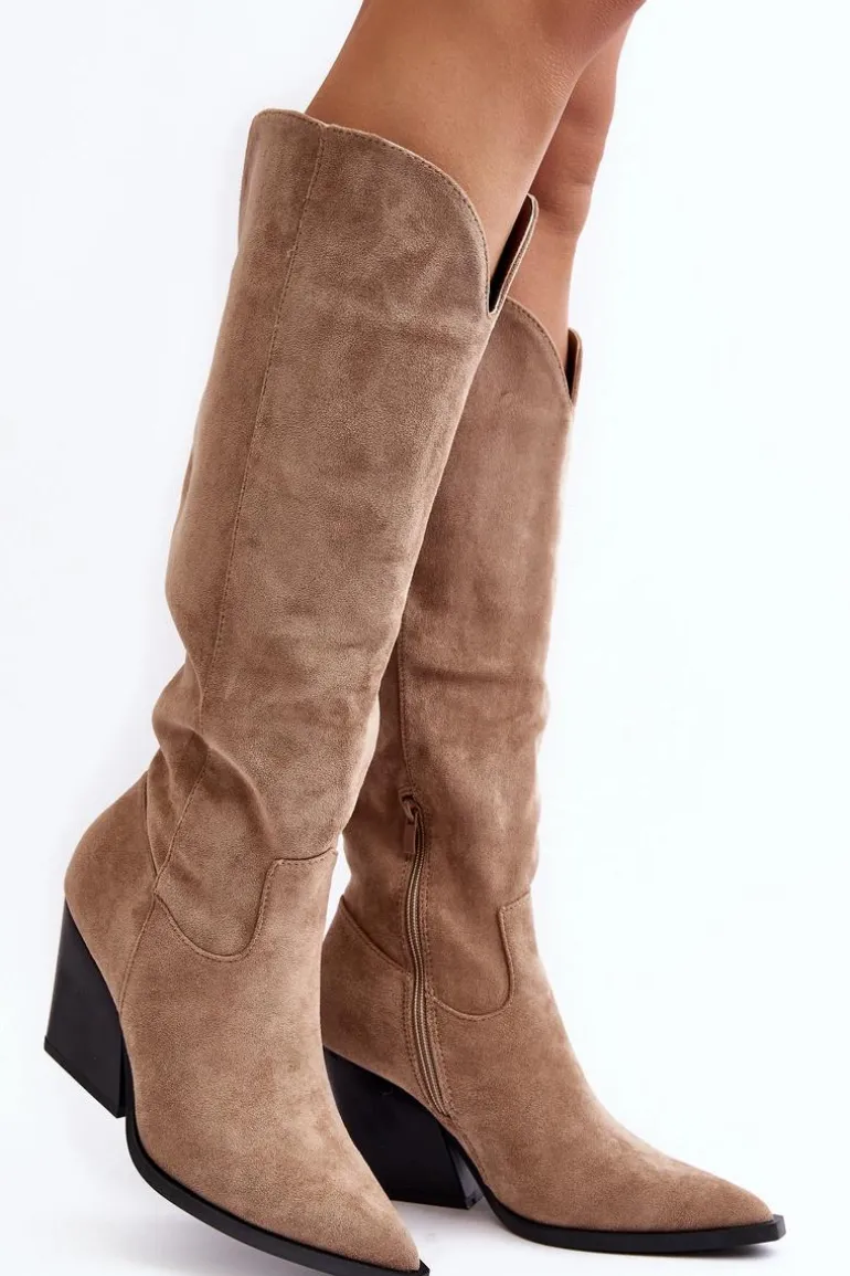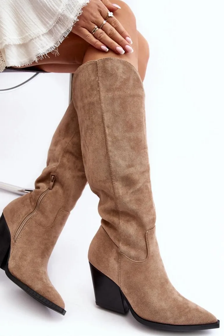 Kozaki damskie zostały wykonane z eko zamszu. Osadzone na obcasie w postaci masywnego słupka. Model ten jest wsuwany i zapinany częściowo na suwak z boku. Zapiętek jest usztywniony. Ten model skradnie serce niejednej miłośniczce kozaków w stylu kowbojek! Koniecznie powinnaś je mieć! Przy wyborze rozmiaru prosimy sugerować się tabelą rozmiarów.