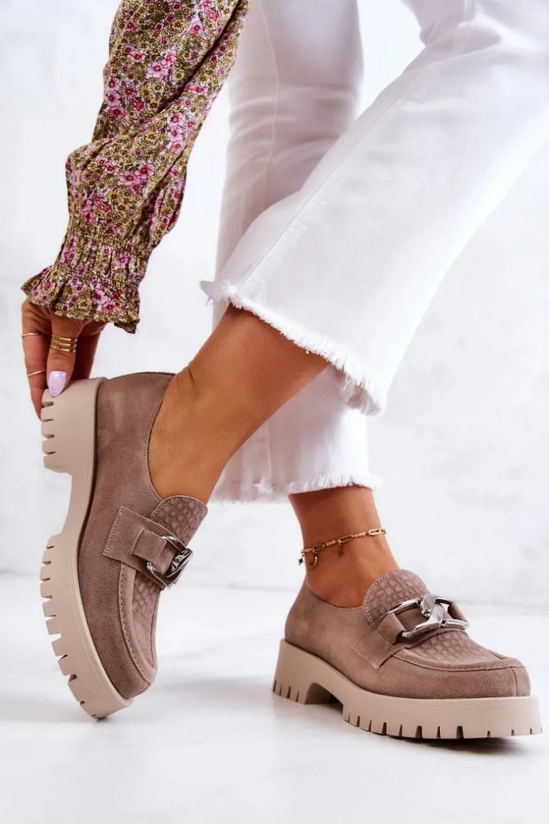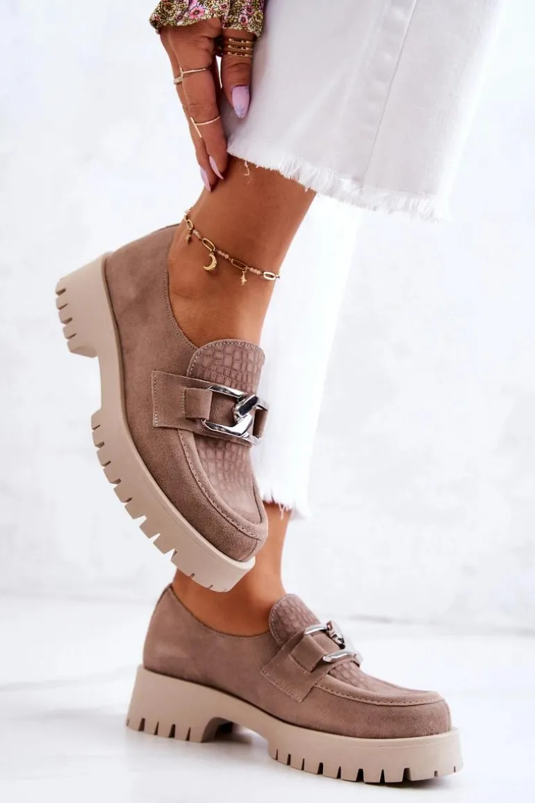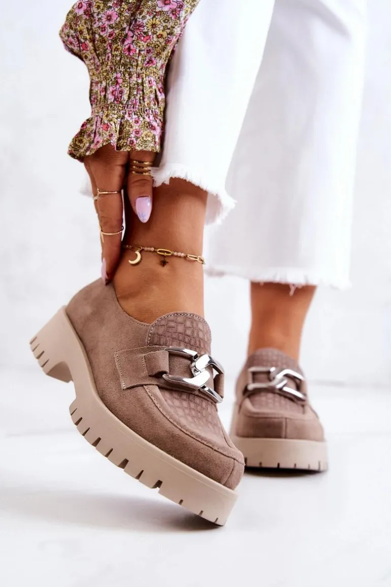 Półbuty wsuwane wykonane z naturalnego zamszu z zaokrąglonym noskiem. Osadzone na masywnej platformie i płaskim, stabilnym obcasie. Model z wysokim bieżnikiem na podeszwie. Na górze dekoracyjny łańcuch. Pod językiem znajduje się elastyczna gumka ściągająca, dzięki której but będzie bardziej dopasowany do stopy. Półbuty posiadają usztywniany zapiętek. Modne, wygodne, wykonane z dbałością o szczegóły – jednym słowem: idealne! Miękka, wykonana z naturalnej skóry wkładka zadba o Twój komfort. Przy wyborze rozmiaru prosimy sugerować się tabelą rozmiarów.