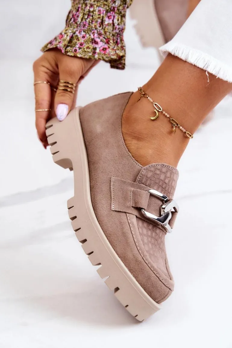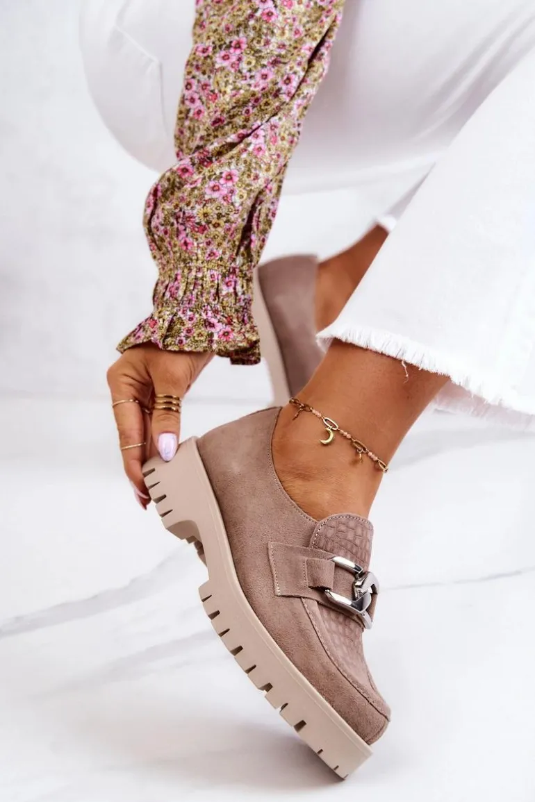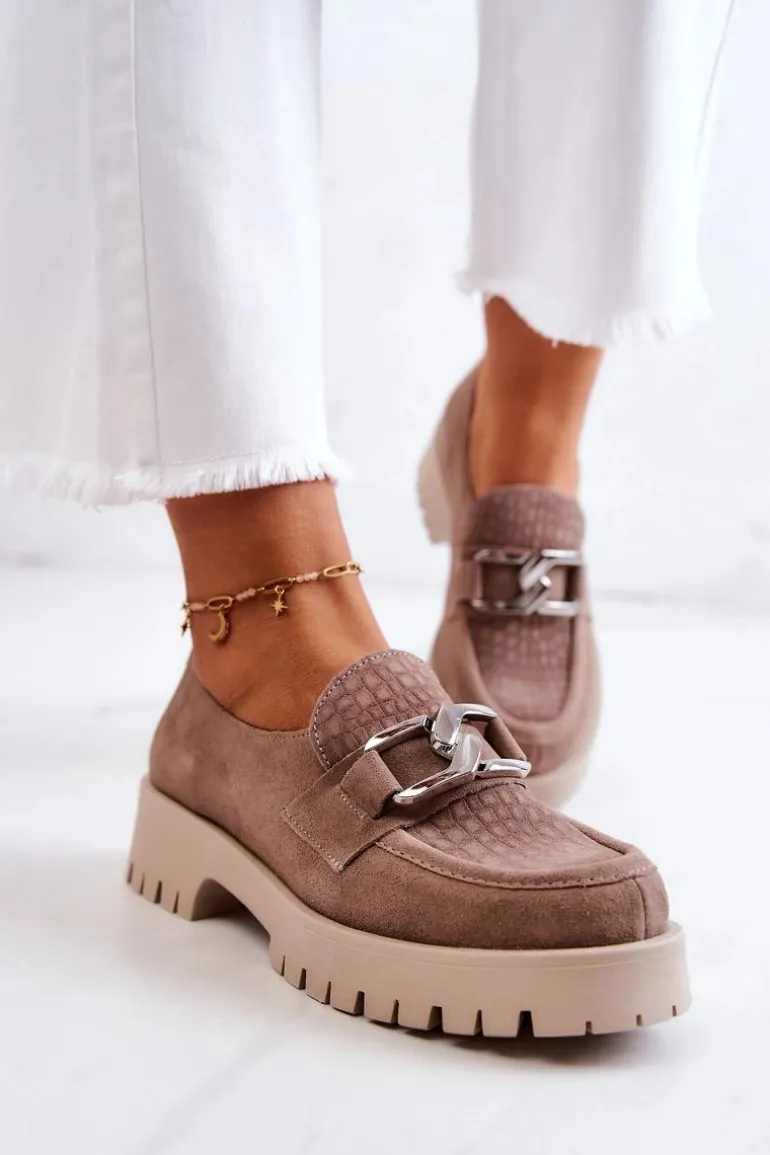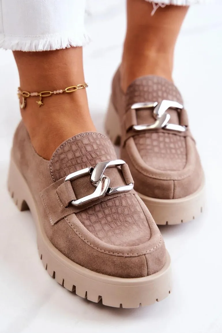 Półbuty wsuwane wykonane z naturalnego zamszu z zaokrąglonym noskiem. Osadzone na masywnej platformie i płaskim, stabilnym obcasie. Model z wysokim bieżnikiem na podeszwie. Na górze dekoracyjny łańcuch. Pod językiem znajduje się elastyczna gumka ściągająca, dzięki której but będzie bardziej dopasowany do stopy. Półbuty posiadają usztywniany zapiętek. Modne, wygodne, wykonane z dbałością o szczegóły – jednym słowem: idealne! Miękka, wykonana z naturalnej skóry wkładka zadba o Twój komfort. Przy wyborze rozmiaru prosimy sugerować się tabelą rozmiarów.
