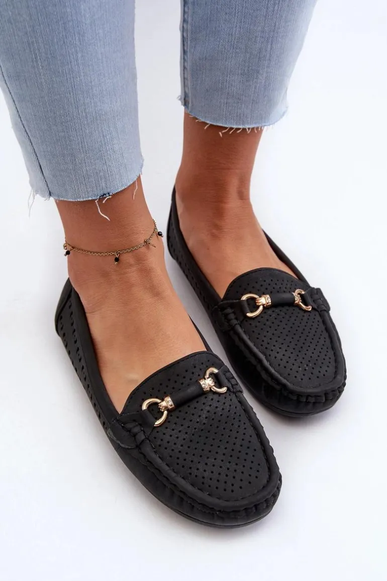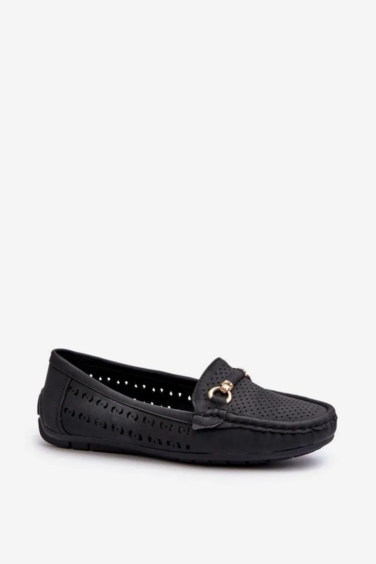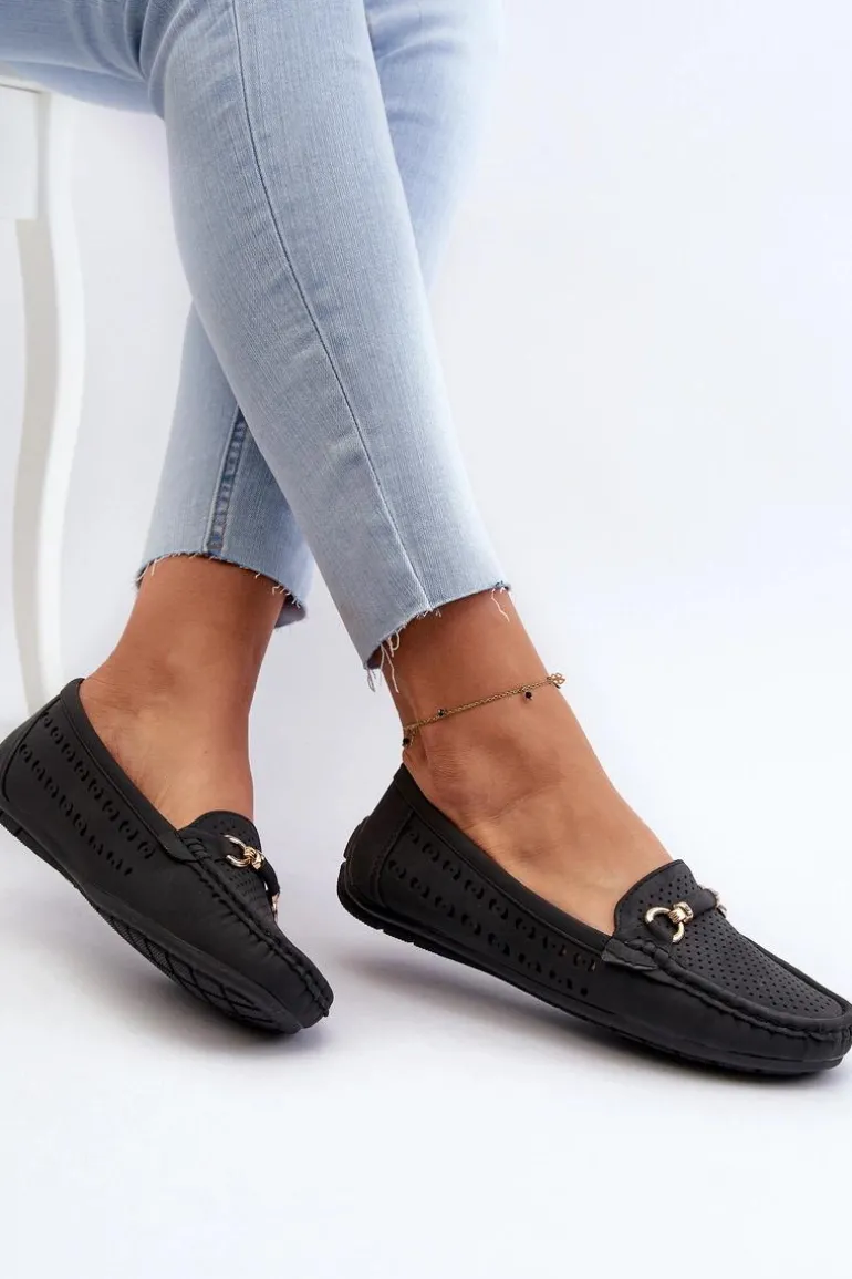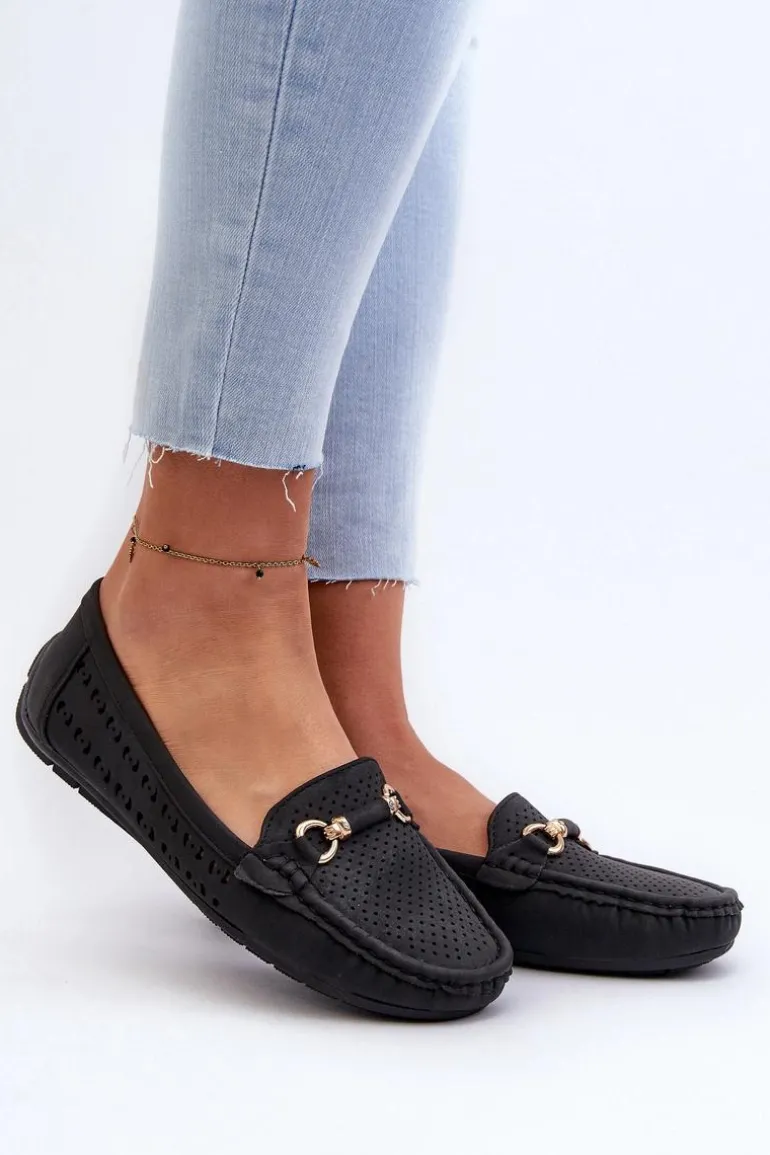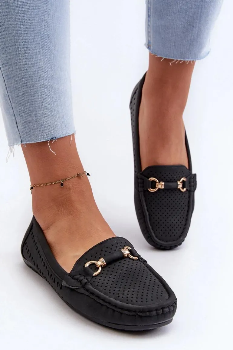 Damskie ażurowe mokasyny wykonane z eko skóry. Złota ozdoba z przodu nadaje im unikalnego charakteru. Miękka wkładka zapewni wygodę podczas użytkowania. Doskonałe na wiele różnych okazji, te mokasyny sprawią, że Twoja stylizacja będzie wyjątkowa i stylowa. Przy wyborze rozmiaru prosimy sugerować się tabelą rozmiarów.