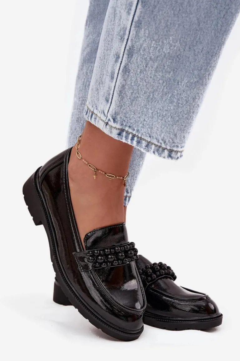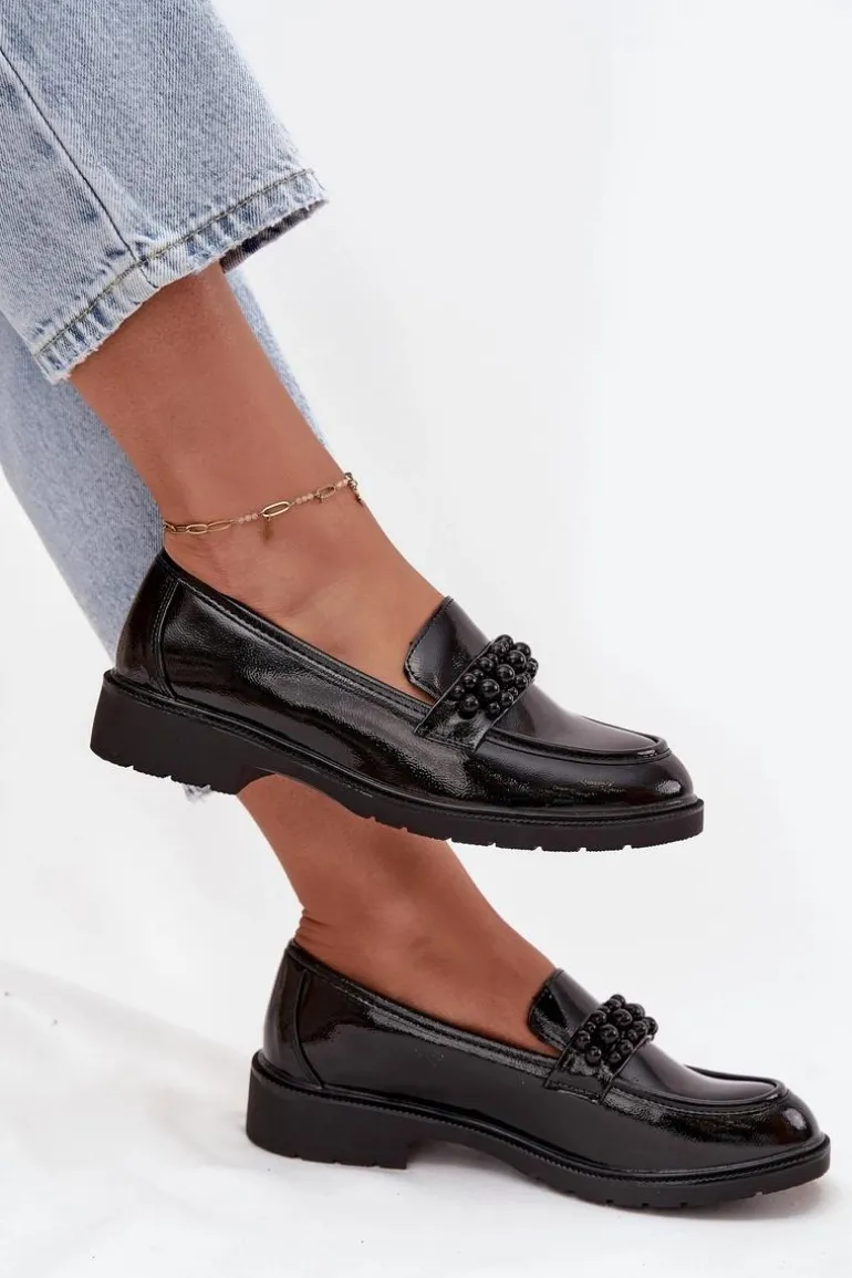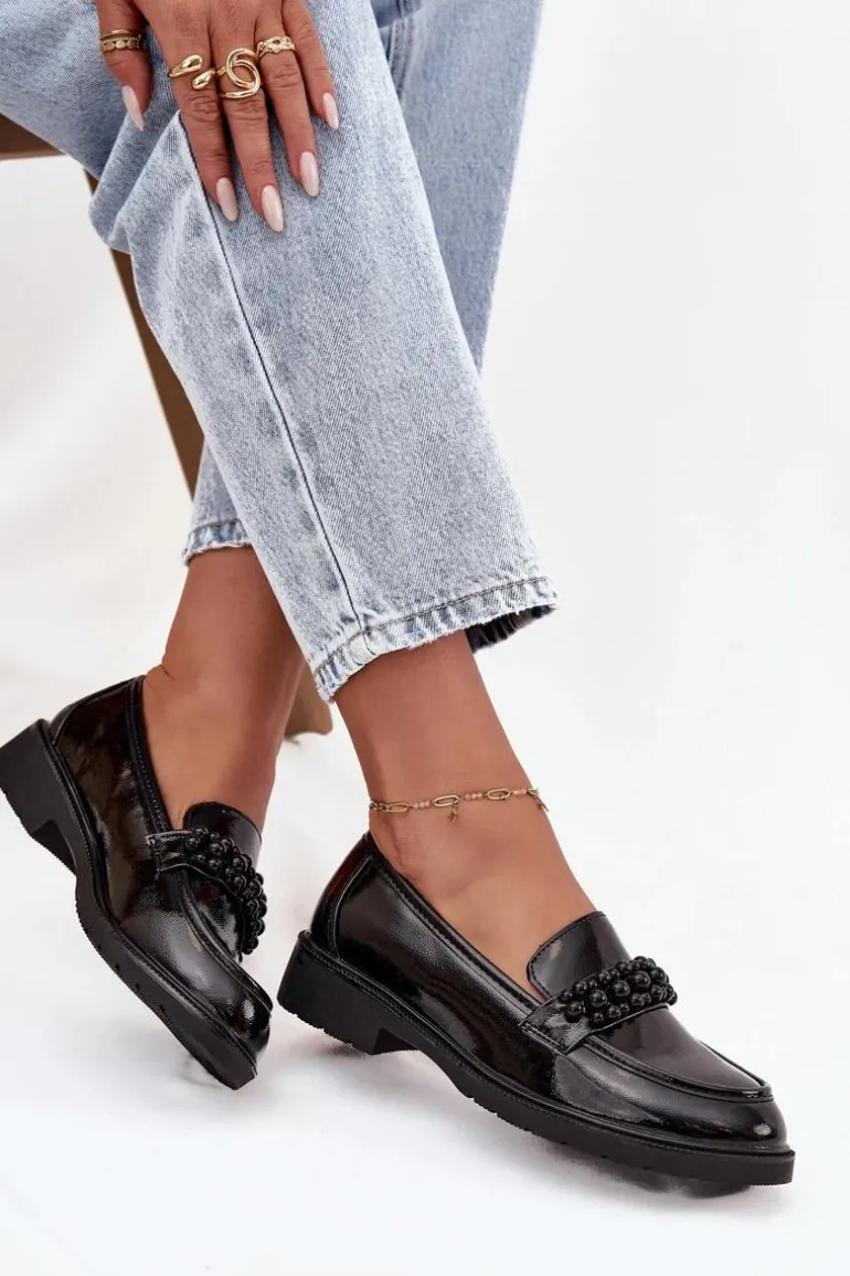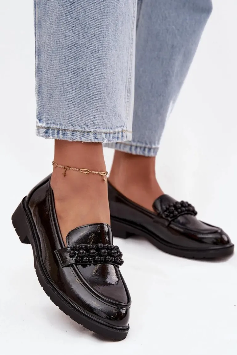 Mokasyny damskie marki S.Barski to stylowa propozycja, która łączy elegancję z wygodą. Wykonane z lakierowanej eko skóry prezentują się szykownie i przyciągają uwagę subtelnym połyskiem. Z przodu umieszczono pasek zdobiony ozdobnymi koralikami, który dodaje oryginalnego charakteru. Zaokrąglone noski podkreślają klasyczny wygląd, a naturalna skórzana wkładka zapewnia komfort noszenia przez cały dzień. To uniwersalny model, który świetnie sprawdzi się zarówno w codziennych stylizacjach, jak i w eleganckich zestawach.