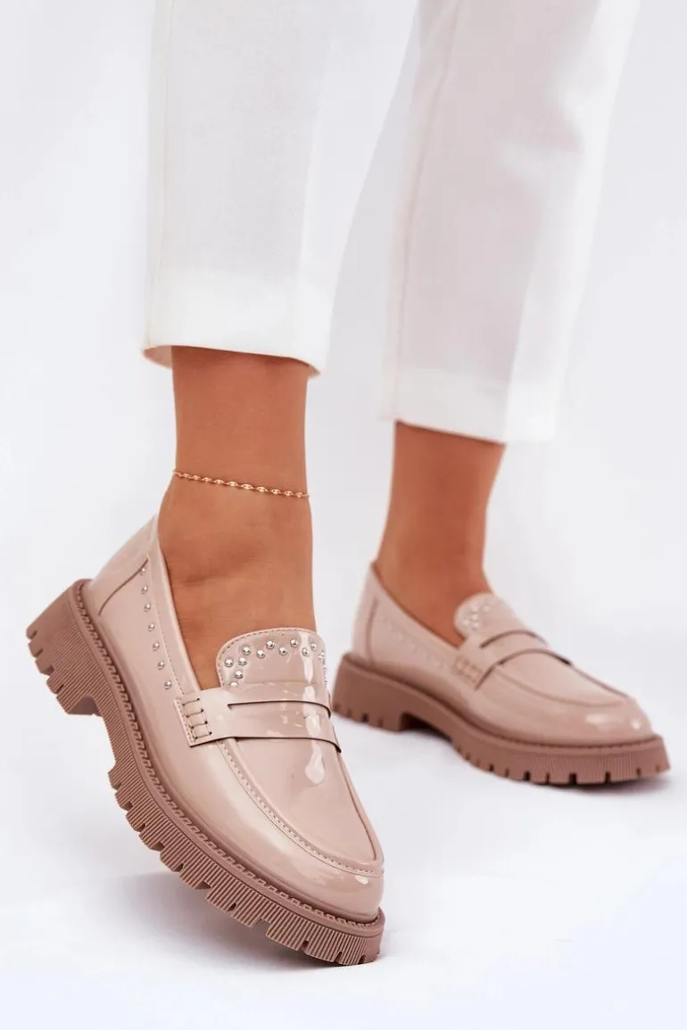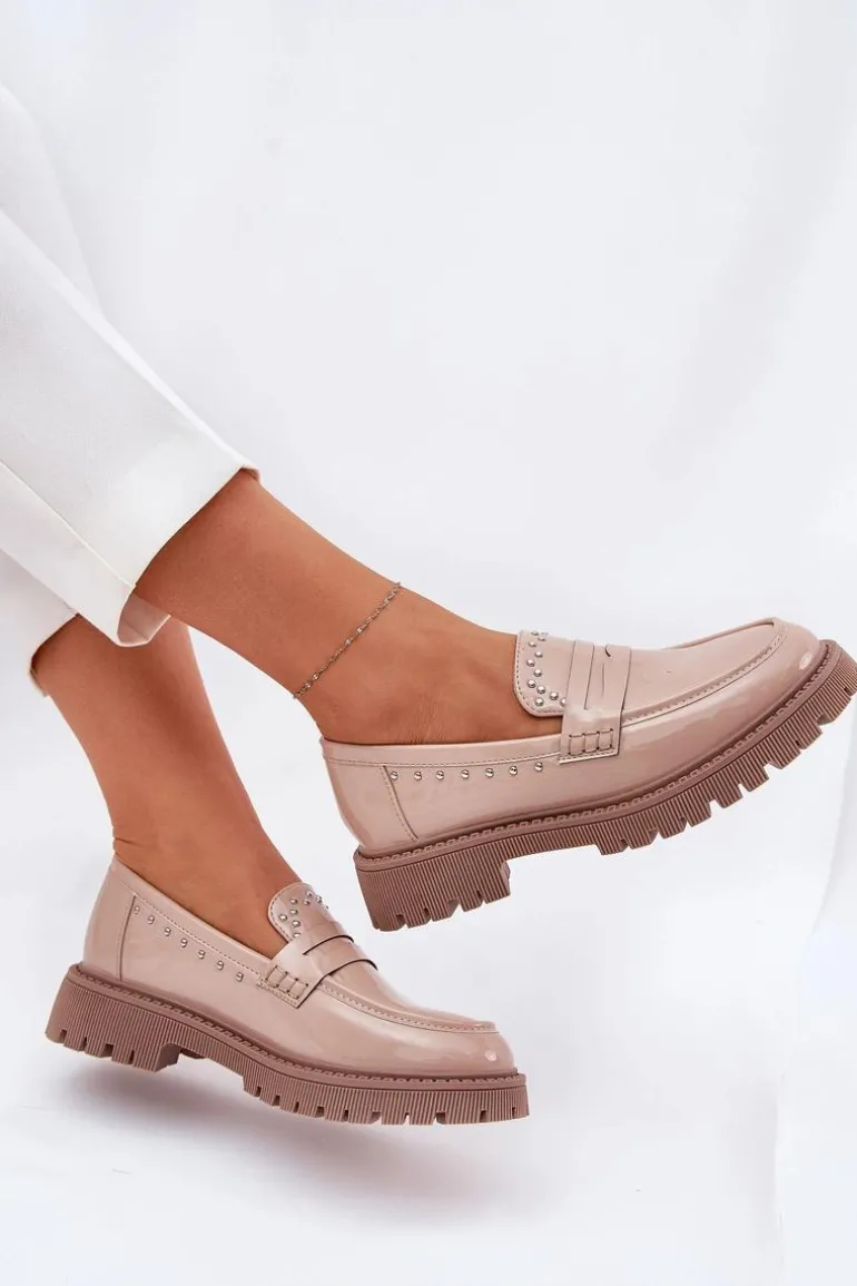 Stylowe mokasyny damskie wykonane z lakierowanej eko skóry. Osadzone na płaskim obcasie. Zaokrąglone noski dodają im subtelnej lekkości, a cholewka ozdobiona zdobieniem nadaje wyjątkowego charakteru. Te mokasyny doskonale pasują do eleganckich oraz casualowych stylizacji, wprowadzając nowoczesny akcent do każdej okazji. Idealne na co dzień, gwarantują komfort i modny wygląd przez cały dzień. Przy wyborze rozmiaru prosimy sugerować się tabelą rozmiarów.