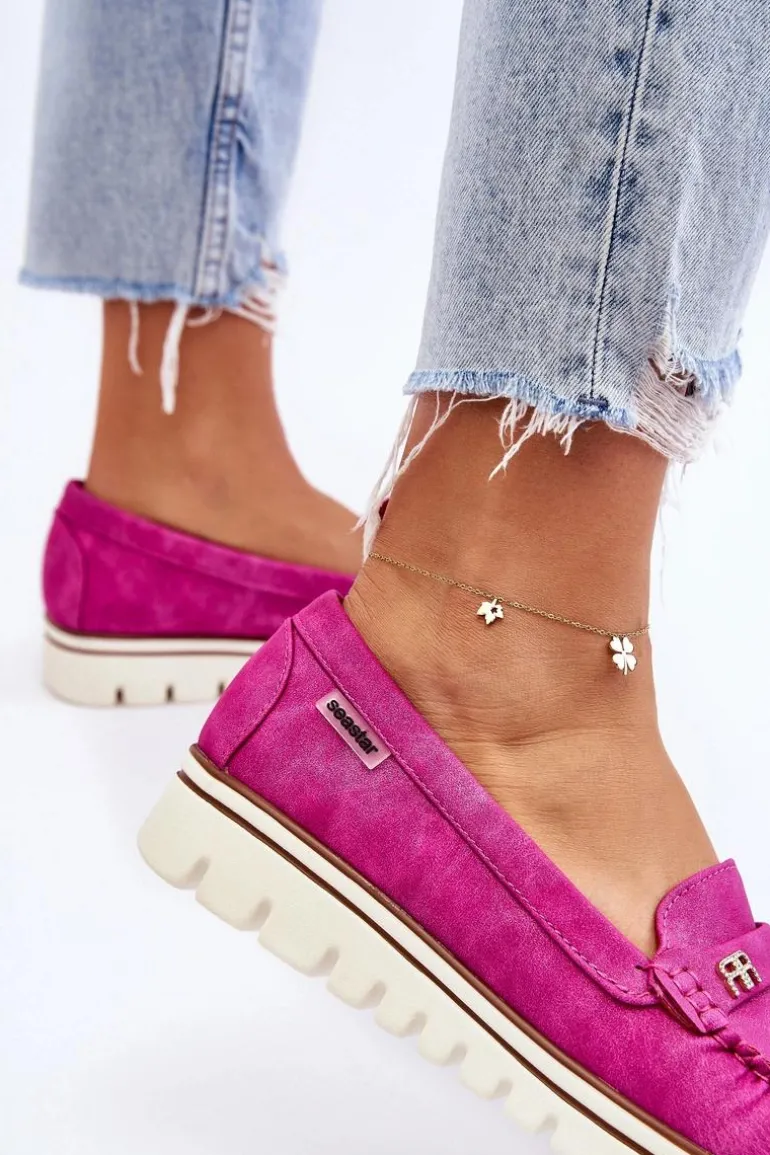 Klasyczne, damskie mokasyny zostały wykonane z eko skóry. Posiadają na przodzie paseczek z ozdobą. Model ten został osadzony na platformie i niskim koturnie. Wkładka w tym obuwiu została wykonana z naturalnej skóry i jest niezwykle wygodna w użytkowaniu. Przy wyborze rozmiaru prosimy sugerować się tabelą rozmiarów.