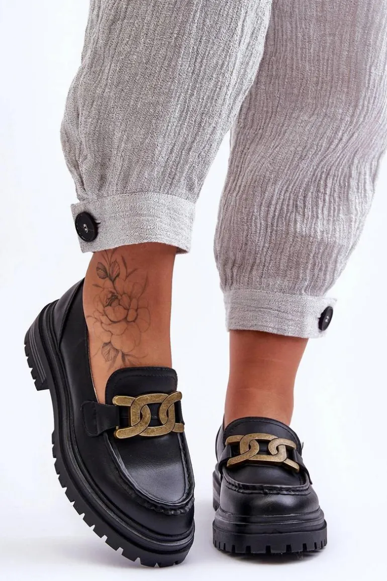 Stylowe, damskie mokasyny świetnie sprawdzą się do wielu stylizacji! Wykonane zostały z eko skóry. Model ten osadzony jest na masywnej platformie i płaskim obcasie. Z przodu znajduje się ozdoba. Koniecznie powinnaś je mieć! Przy wyborze rozmiaru prosimy sugerować się tabelą rozmiarów.