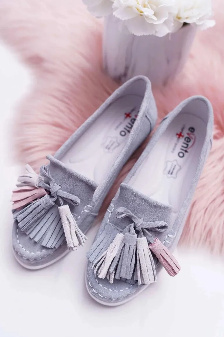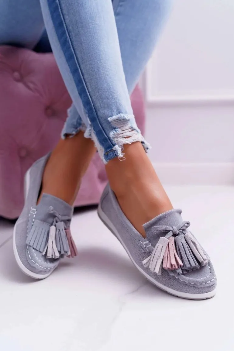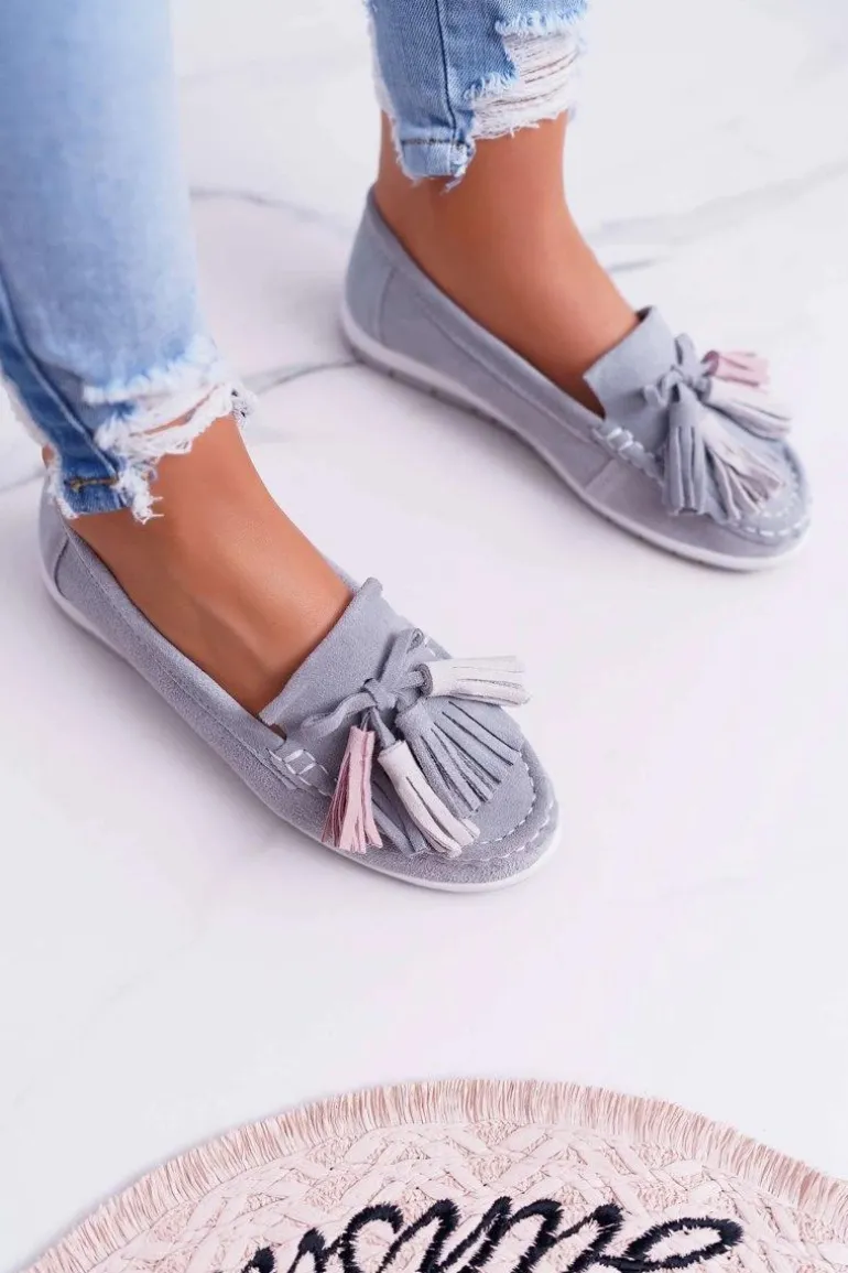 Mokasyny Damskie Skórzane Zamszowe Z Frędzlami Szare Batist