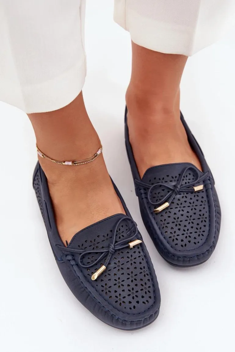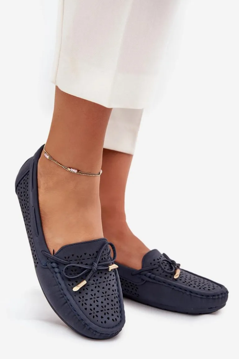 Mokasyny damskie wykonane z eko skóry, ozdobione ażurowym wzorkiem, to doskonała propozycja na wiosnę i lato. Z przodu znajdują się wiązanie w formie kokardki, które dodaje subtelności i uroku. Miękka wkładka zapewnia komfort przez cały dzień, a zaokrąglone noski gwarantują wygodę. Doskonałe do casualowych stylizacji, świetnie komponują się z sukienkami, spódnicami i spodniami, wprowadzając do każdej kreacji lekkość i elegancję. Przy wyborze rozmiaru prosimy sugerować się tabelą rozmiarów.
