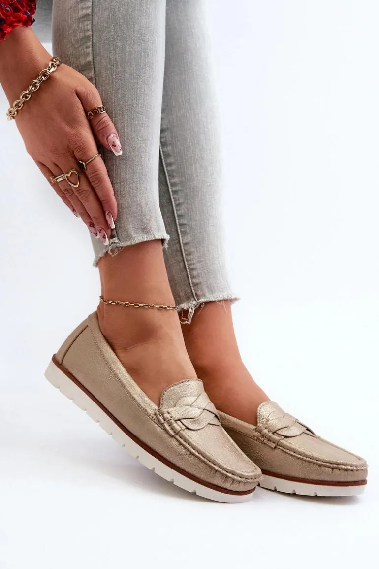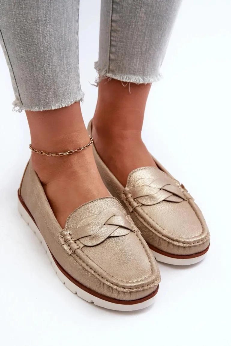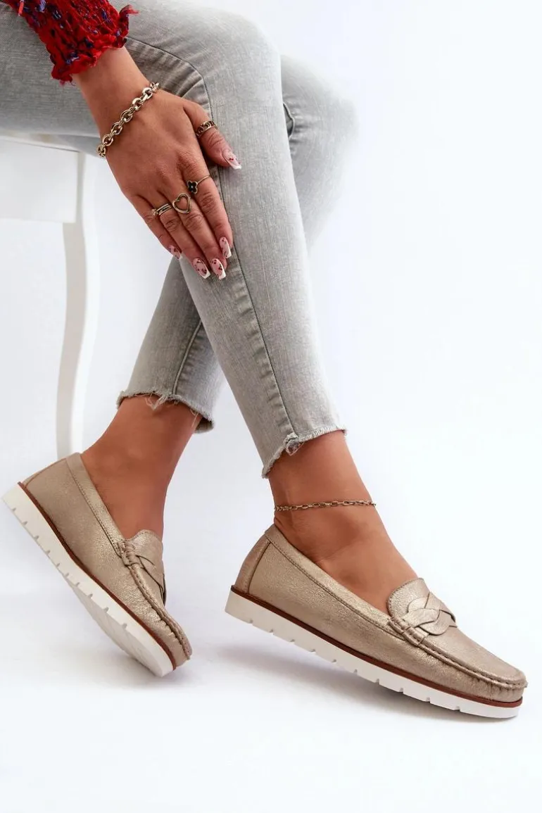 Mokasyny damskie wykonane z eko skóry. Przód ozdobiony przeplatającymi się paseczkami. Noski zaokrąglone. Miękka wkładka ze skóry naturalnej. Podeszwa z gumowego tworzywa. Model ten doskonale dopełni wiele casualowych stylizacji. Przy wyborze rozmiaru prosimy sugerować się tabelą rozmiarów.