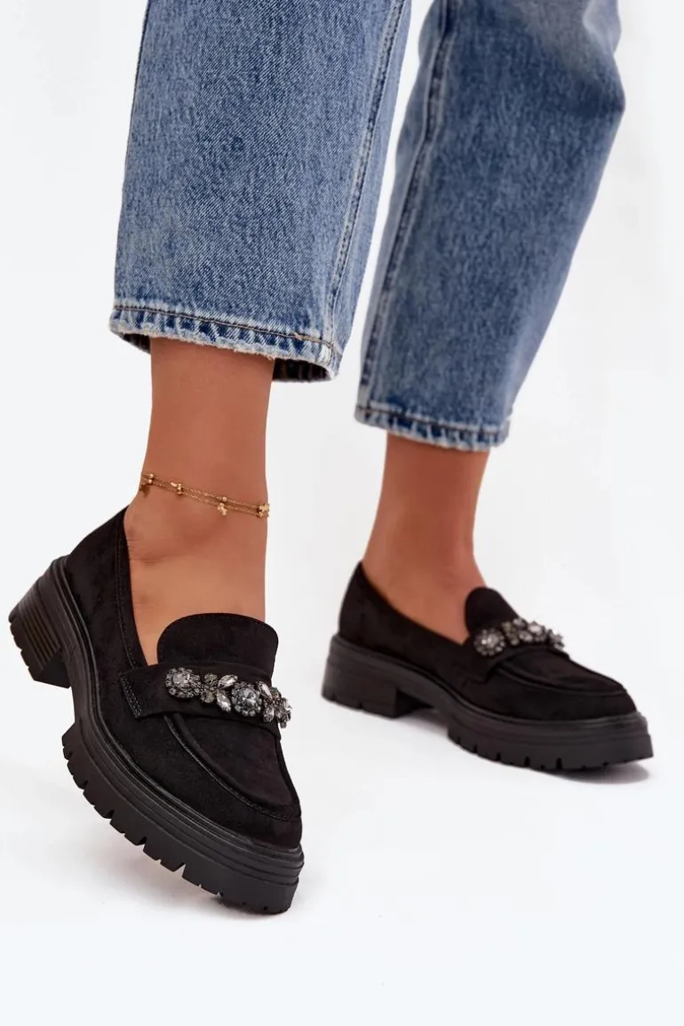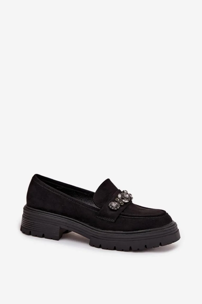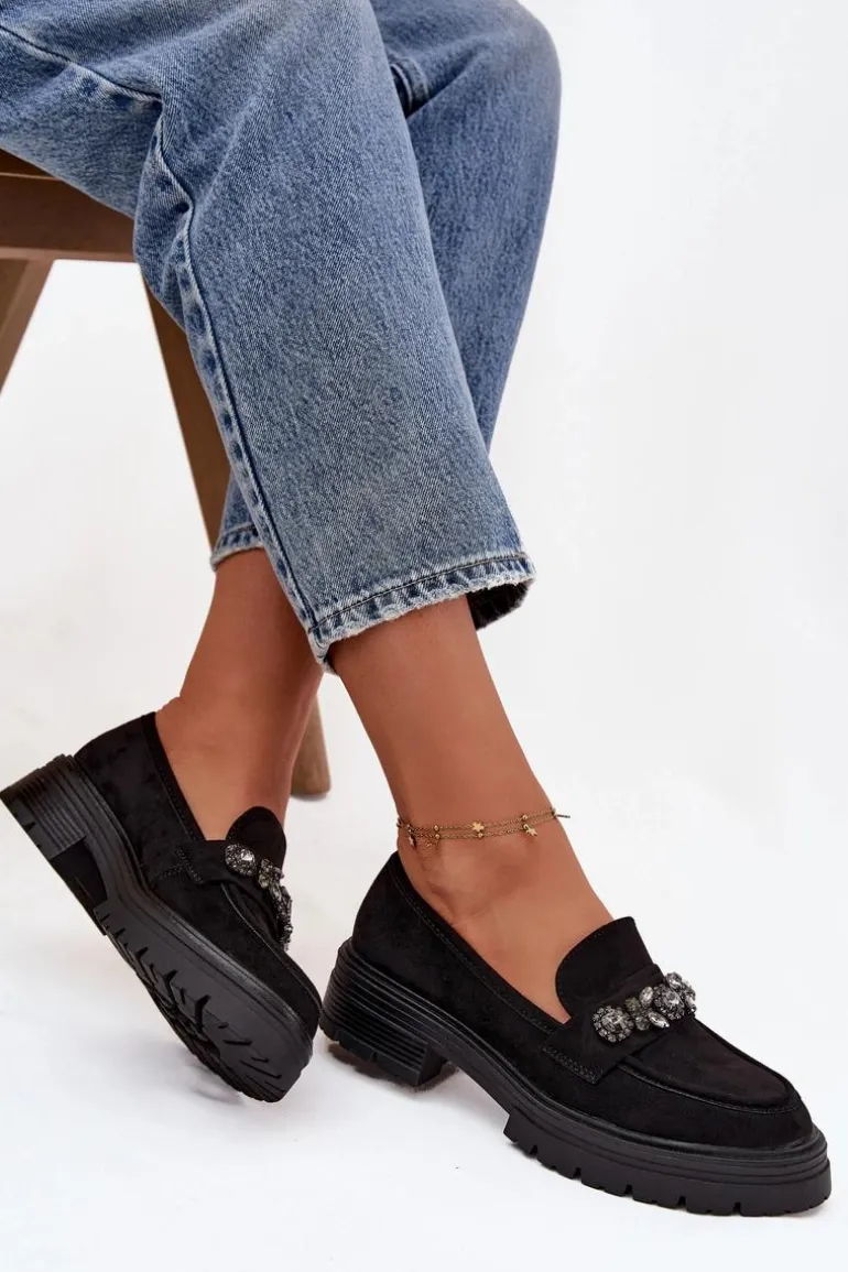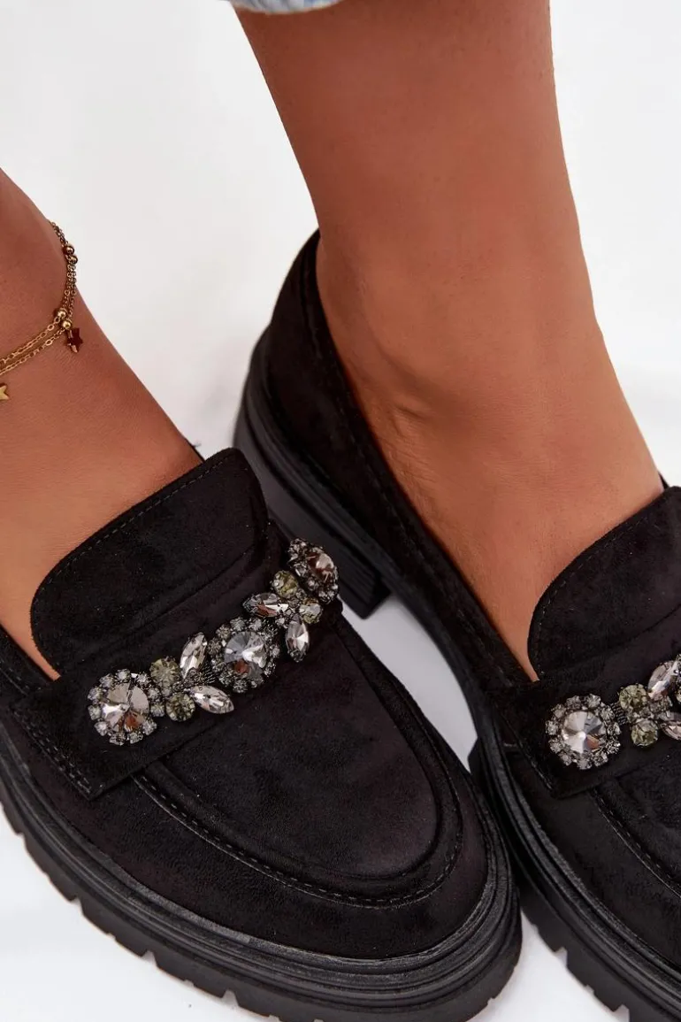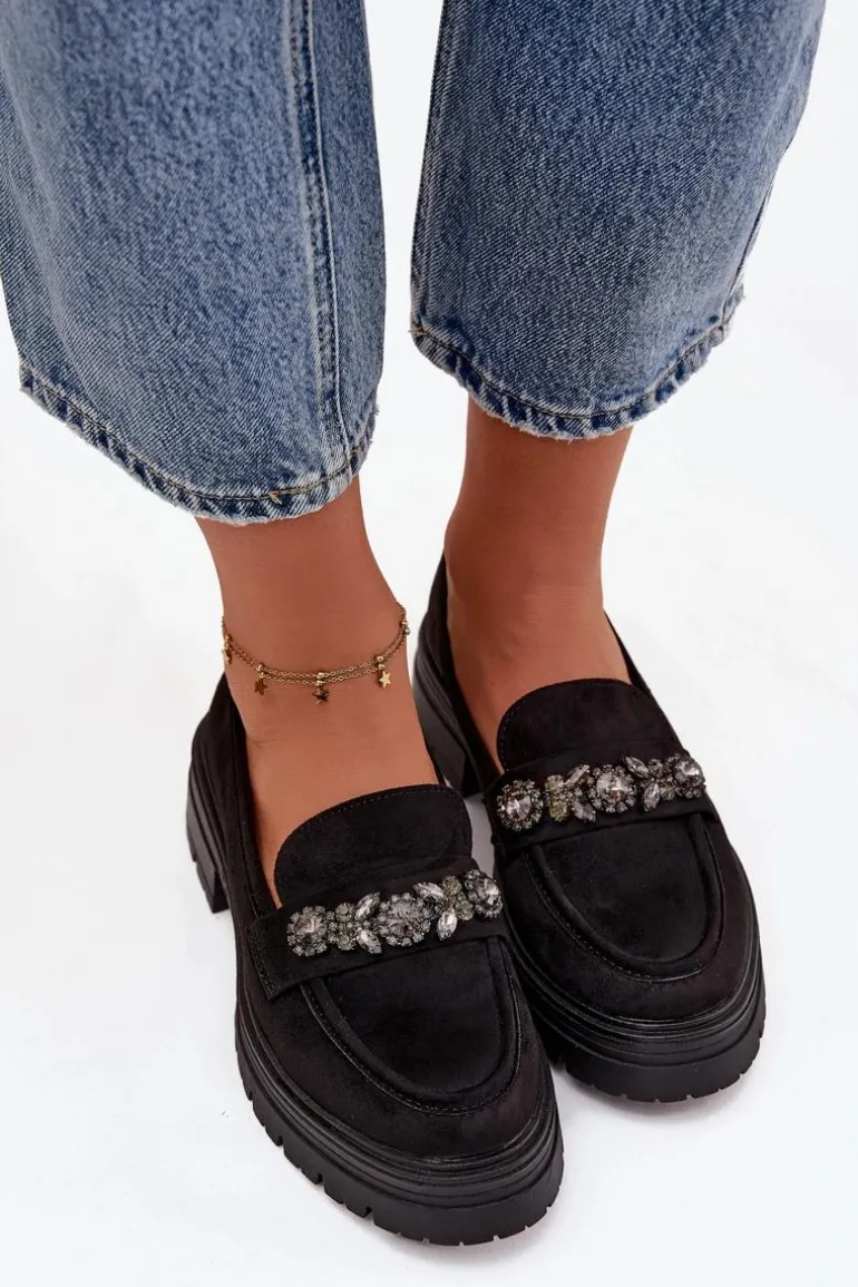Mokasyny damskie wykonane z eko zamszu. Model osadzony na platformie z płaskim obcasem zapewnia stabilność i komfort podczas chodzenia. Z przodu, na pasku, umieszczono ozdobne kryształki, które dodają całości subtelnego blasku i kobiecego uroku. To doskonały wybór zarówno do codziennych, jak i bardziej eleganckich stylizacji – świetnie prezentują się z jeansami, spodniami materiałowymi czy sukienkami! Przy wyborze rozmiaru prosimy sugerować się tabelą rozmiarów.