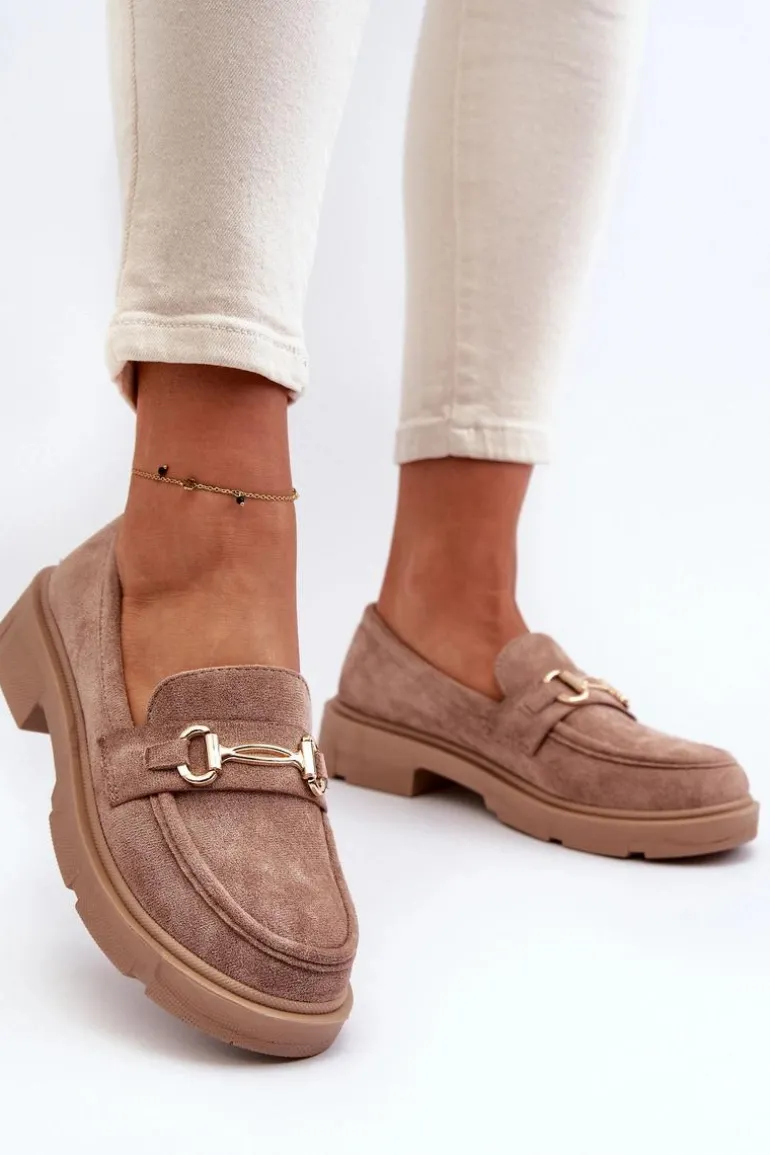 Modne damskie mokasyny wykonane z eko zamszu to absolutny must-have w Twojej garderobie! Przód ozdobiony paseczkiem ze złotą ozdobą, która dodaje im wyjątkowego uroku. Płaski obcas zapewnia wygodę noszenia przez cały dzień. Model ten będzie pasować do różnych stylizacji, dodając im elegancji! Przy wyborze rozmiaru prosimy sugerować się tabelą rozmiarów.