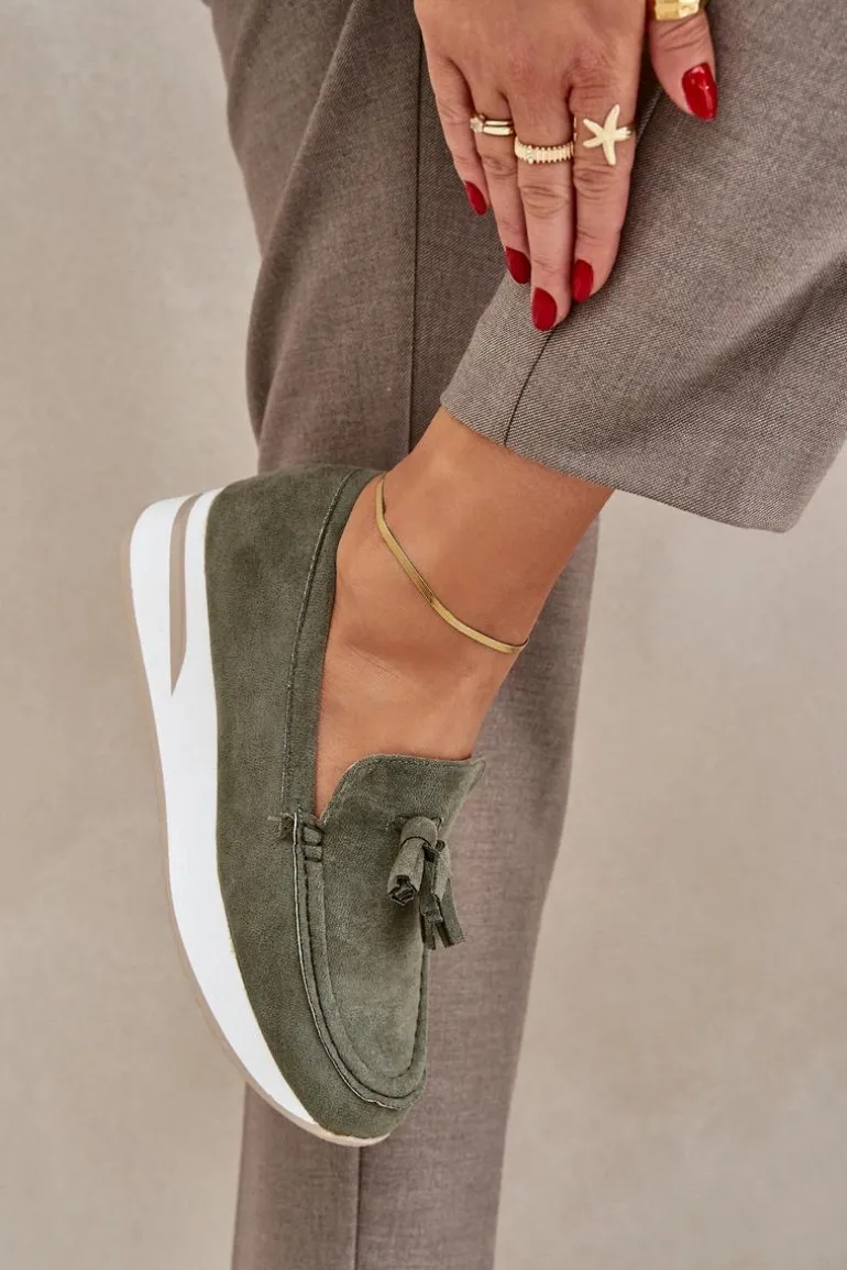 Mokasyny damskie wykonane z eko zamszu. Osadzone na platformie oraz delikatnym koturnie, zapewniają komfort noszenia i dodają lekkości sylwetce. Zaokrąglone noski sprawiają, że obuwie jest niezwykle wygodne, a miękka wkładka dba o komfort przez cały dzień. Całość uzupełniają ozdobne frędzle, które dodają oryginalnego charakteru i stylu. Idealne do codziennych stylizacji! Przy wyborze rozmiaru prosimy sugerować się tabelą rozmiarów.