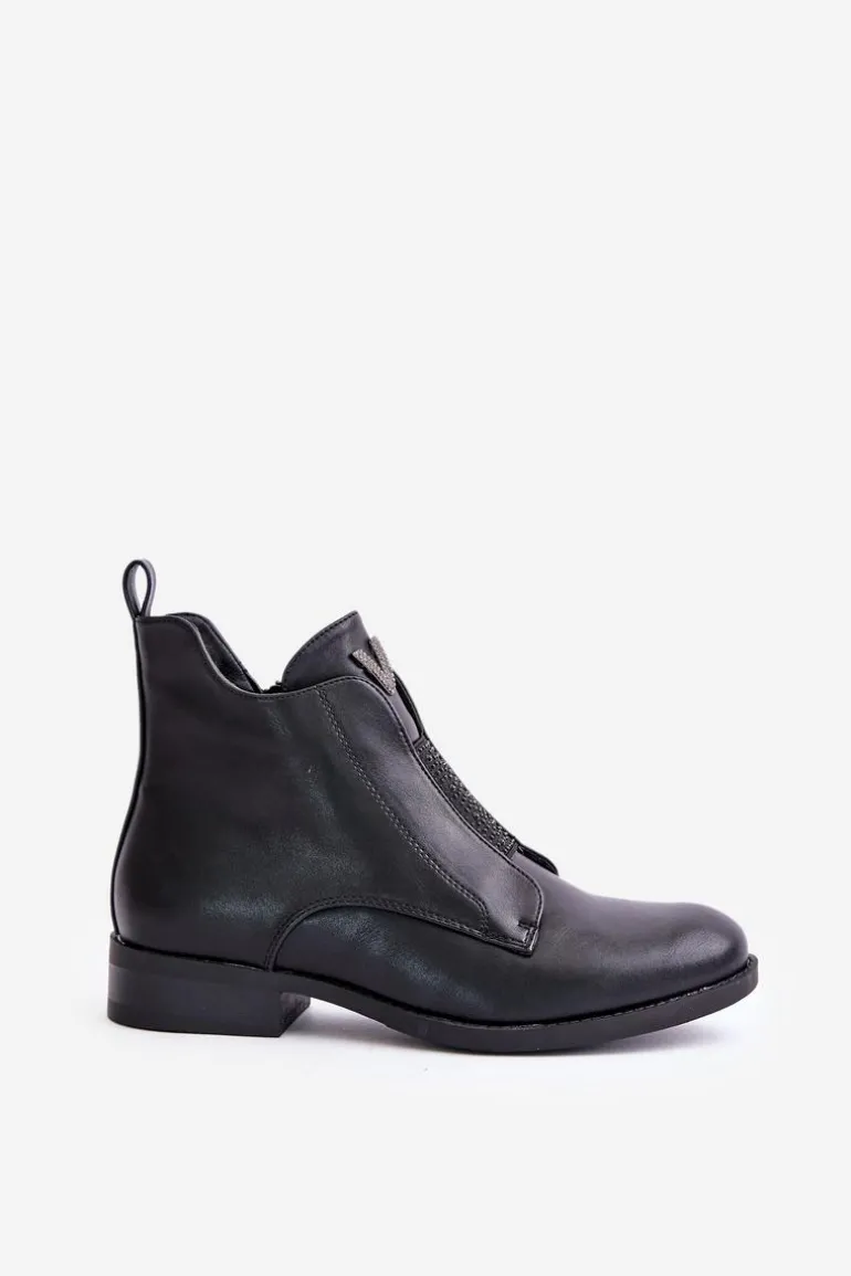 Botki damskie wykonane ze skóry ekologicznej. Osadzone na płaskim obcasie, który zapewni stabilność na każdym kroku. Środek ocieplony kocem obuwniczym. Noski zaokrąglone. Zapinane na zamek. Z przodu zdobiona, elastyczna wstawka oraz mały detal na języku. Cholewka za kostkę. Usztywniony zapiętek. Przy wyborze rozmiaru prosimy sugerować się tabelą rozmiarów.