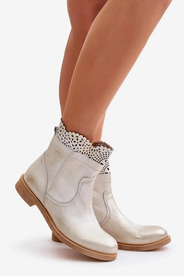 Te śliczne botki damskie zostały wykonane z wysokiej jakości naturalnej skóry. Osadzone na płaskim obcasie, co sprawia, że są niezwykle wygodne i stabilne. Zapinane na suwak z boku cholewki. Model ten posiada ażurowy element na górze cholewki. Noski zaokrąglone. Koniecznie powinnaś je mieć! Przy wyborze rozmiaru prosimy sugerować się tabelą rozmiarów.