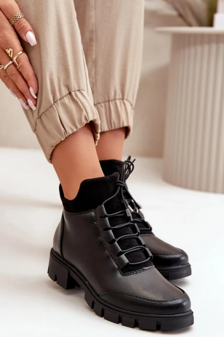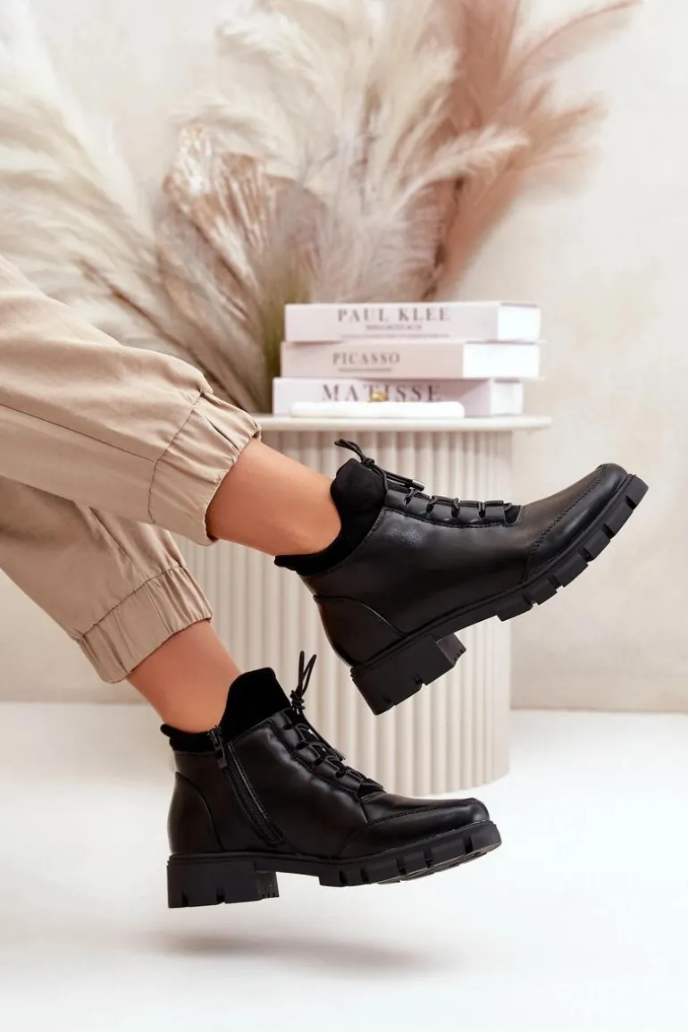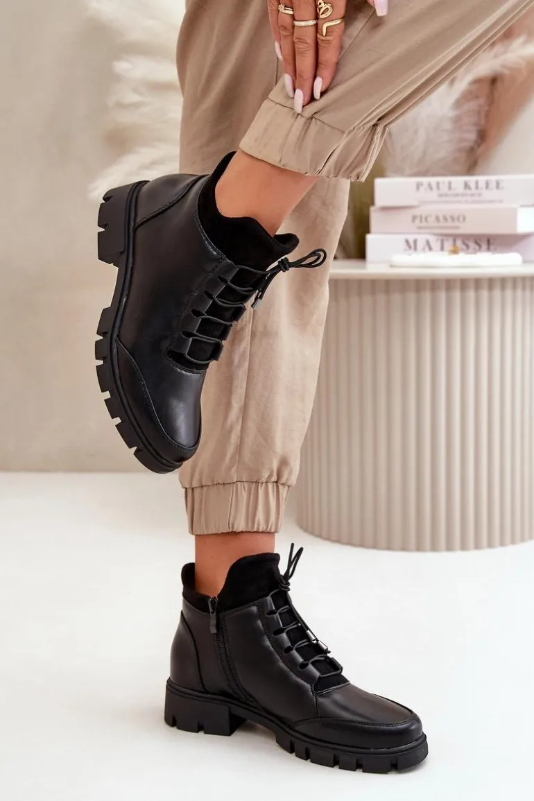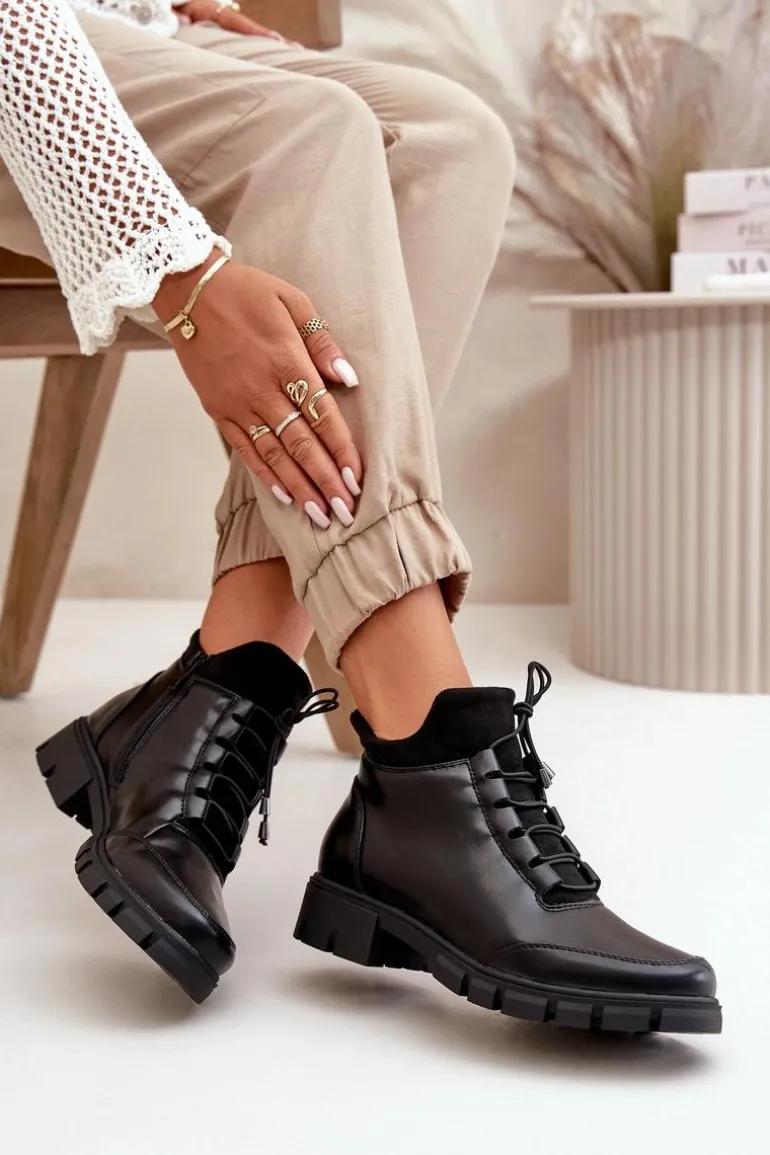 Botki damskie od marki Jezzi. Wykonane z eko skóry. Niska cholewka sięgająca za kostkę. Osadzone na płaskim obcasie. Zapinane na zamek oraz dodatkowo posiadają sznurowanie, co pozwala na idealne dopasowanie do stopy. Środek ocieplony miłym w dotyku kocem obuwniczym. Klasyczny fason do casualowych stylizacji! Przy wyborze rozmiaru prosimy sugerować się tabelą rozmiarów.