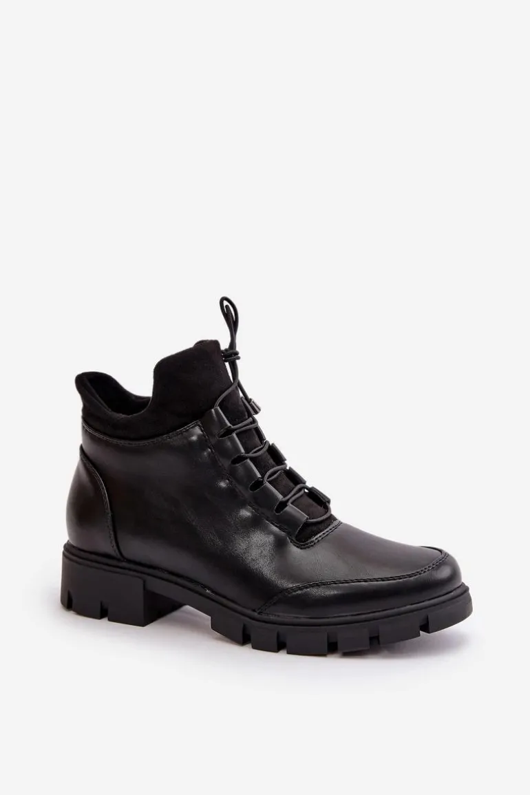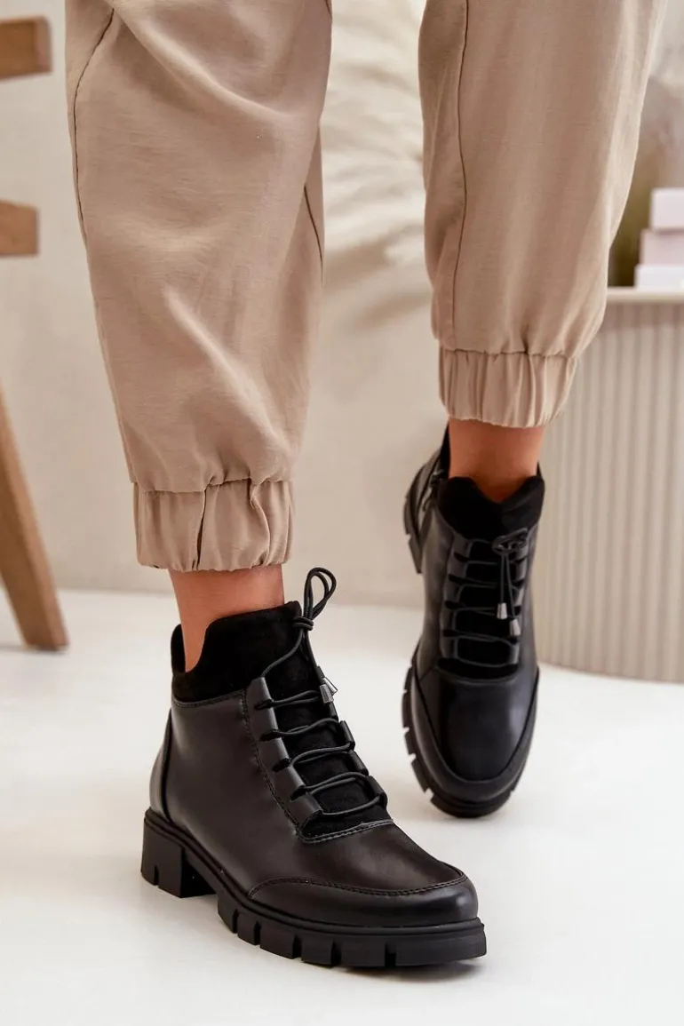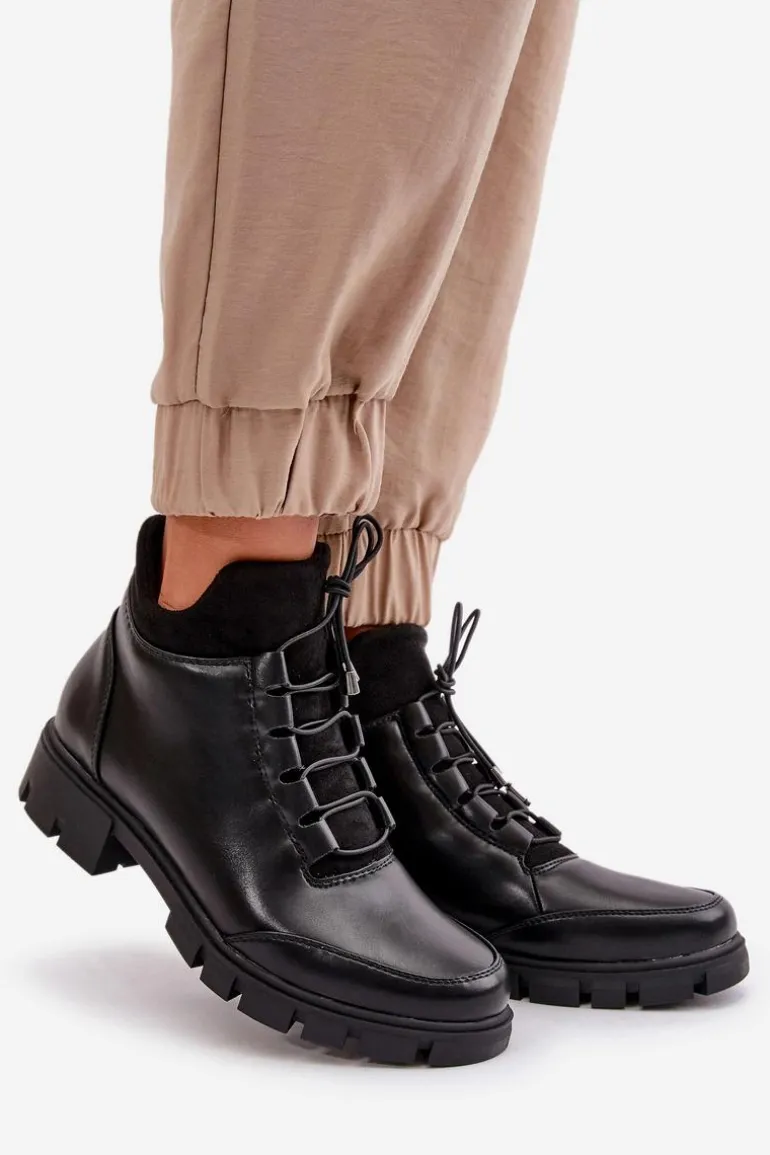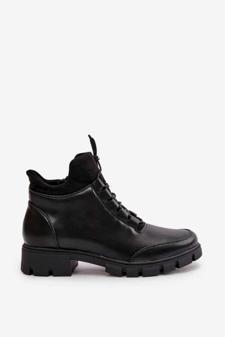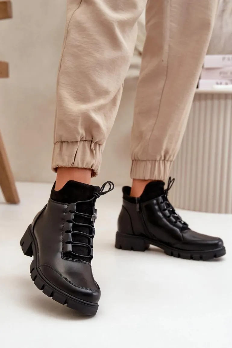 Botki damskie od marki Jezzi. Wykonane z eko skóry. Niska cholewka sięgająca za kostkę. Osadzone na płaskim obcasie. Zapinane na zamek oraz dodatkowo posiadają sznurowanie, co pozwala na idealne dopasowanie do stopy. Środek ocieplony miłym w dotyku kocem obuwniczym. Klasyczny fason do casualowych stylizacji! Przy wyborze rozmiaru prosimy sugerować się tabelą rozmiarów.
