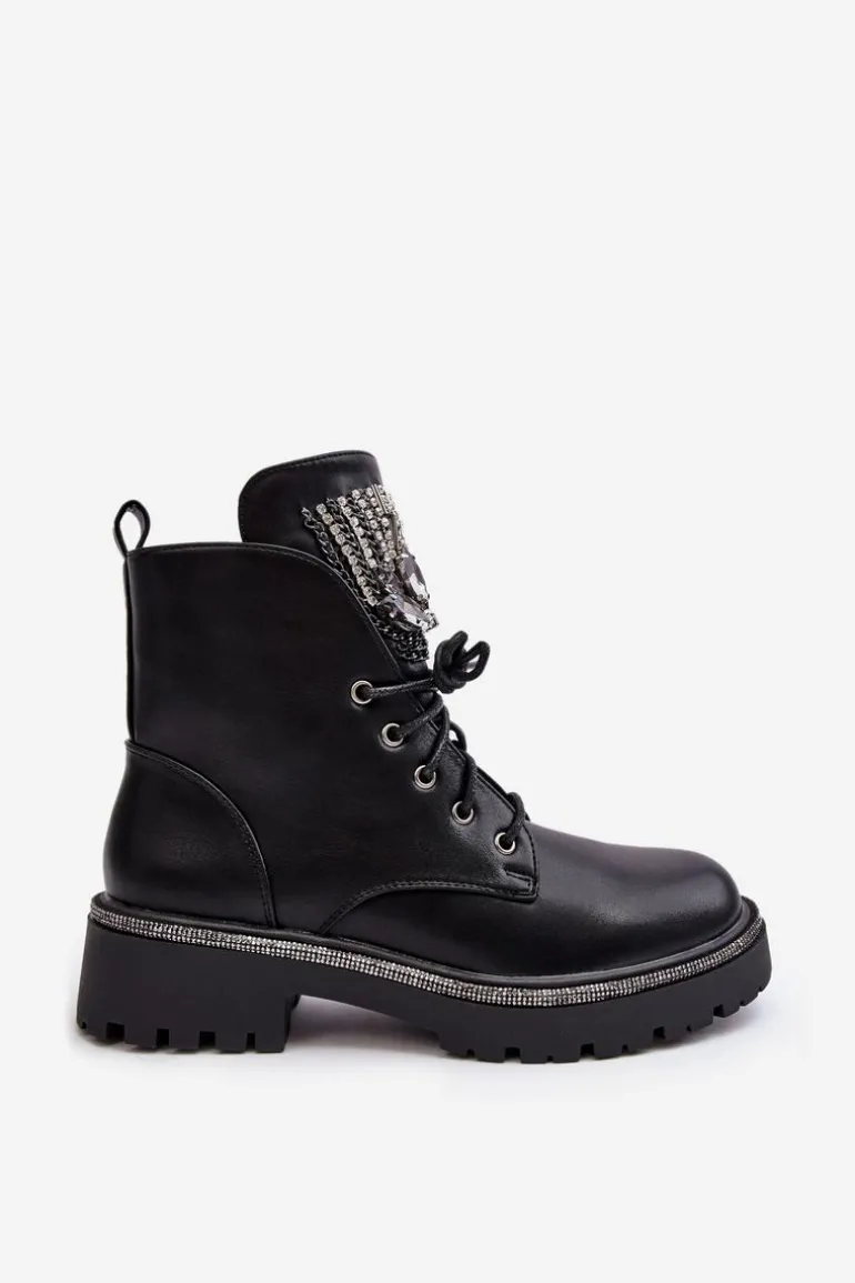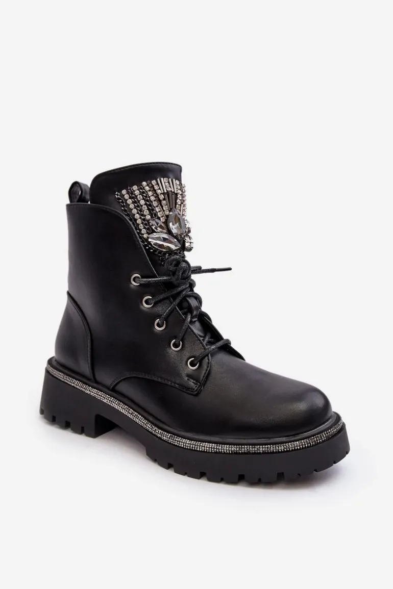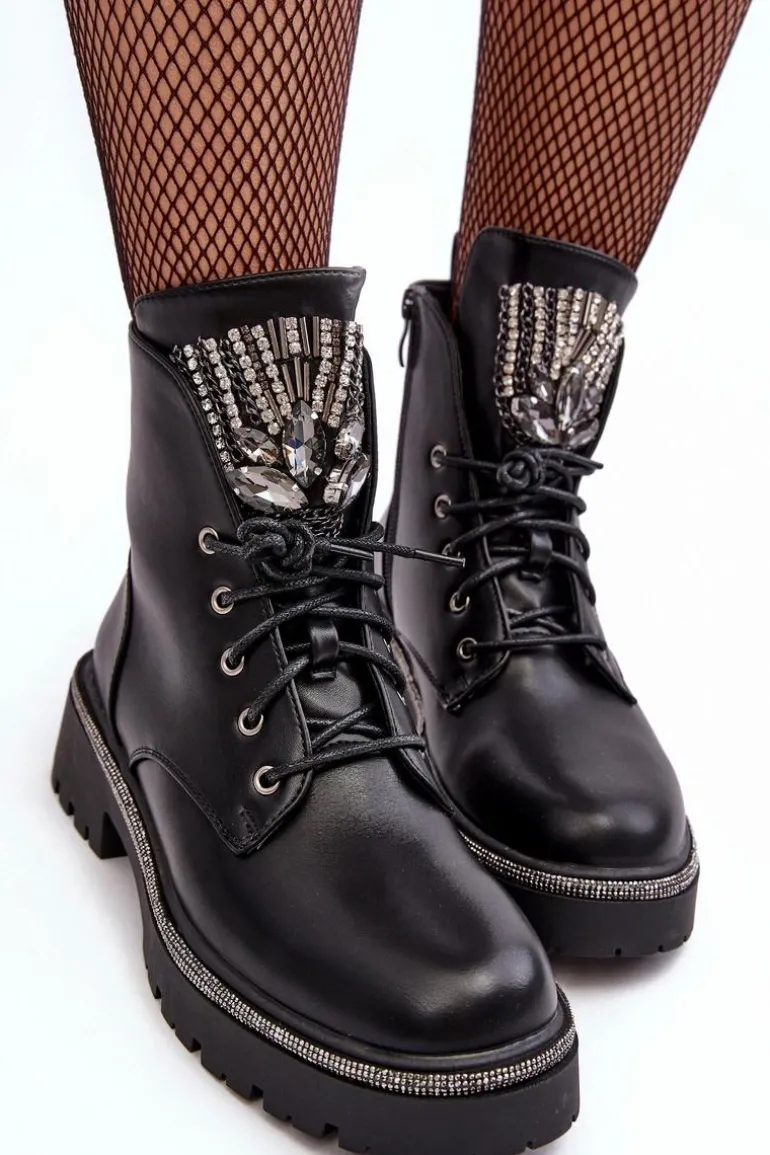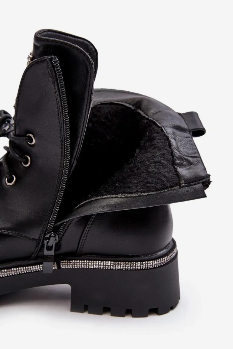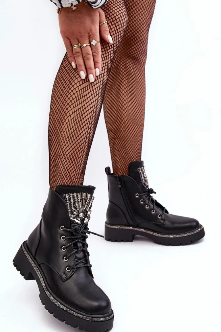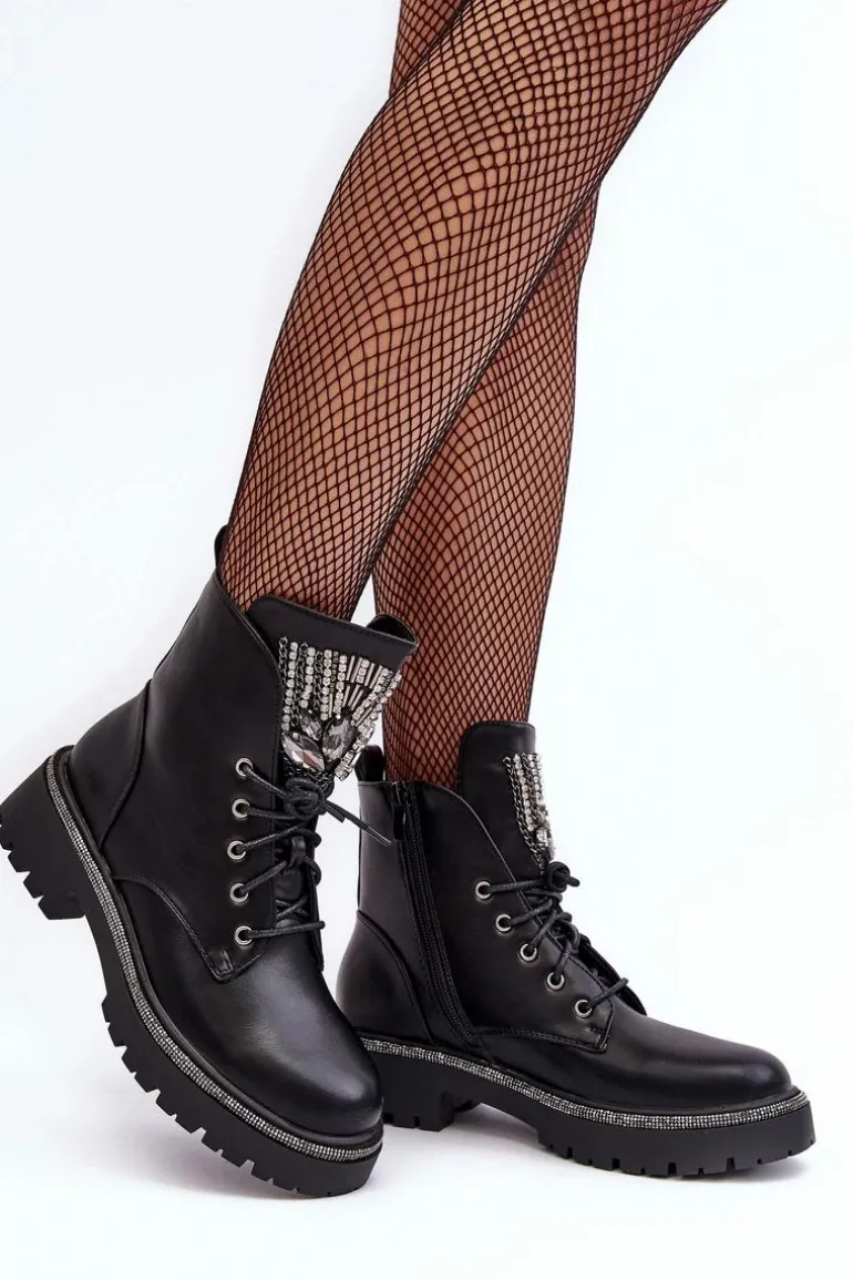 Botki damskie z cholewką za kostkę. Osadzone na płaskim, stabilnym obcasie oraz platformie. Wewnątrz ocieplone kocem obuwniczym. Na języku biżuteryjna ozdoba. Model sznurowany oraz dodatkowo zapinany na suwak z boku. Noski zaokrąglone. Usztyniony zapiętek. To świetne botki na jesień i zimę! Będą pasować do wielu stylizacji. Przy wyborze rozmiaru prosimy sugerować się tabelą rozmiarów.
