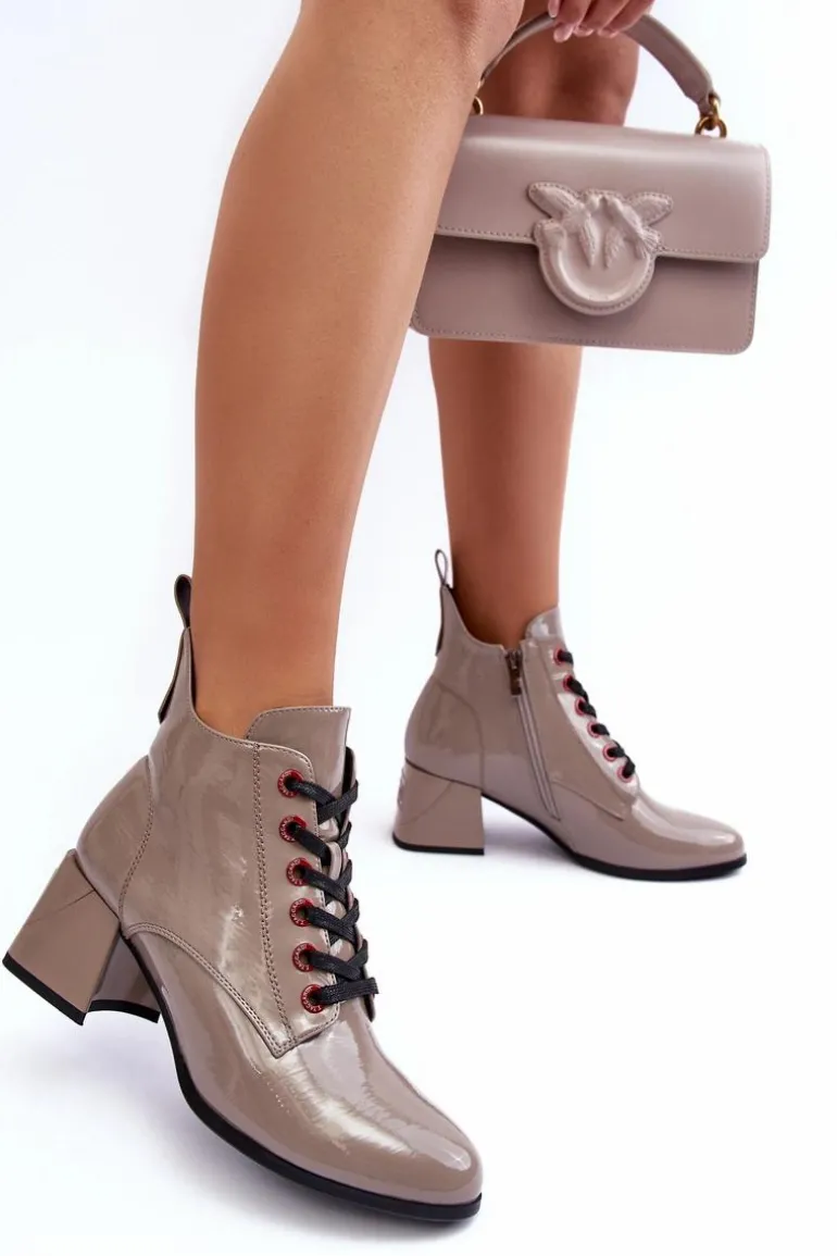 Botki damskie z niską cholewką wykonane z eko skóry. Osadzone na obcasie w postaci klocka. Noski w migdał. Środek ocieplony kocem obuwniczym. Model zapinany na suwak z boku oraz dodatkowo sznurowany. Miękka wkładka zapewni komfortowe użytkowanie obuwia. Zapiętek jest usztywniony. Przy wyborze rozmiaru prosimy sugerować się tabelą rozmiarów.
