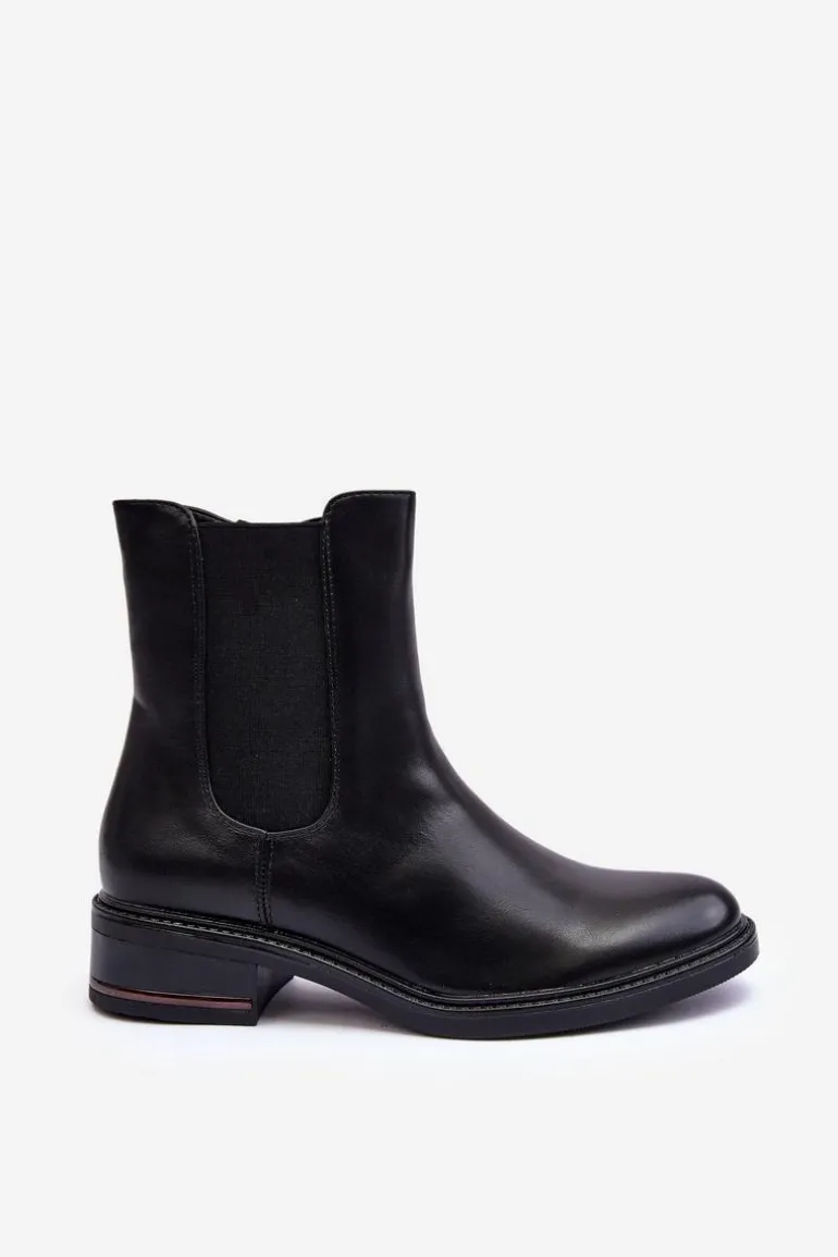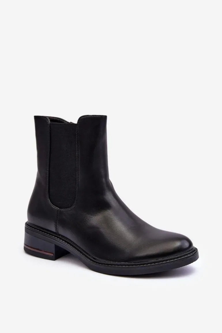 Klasyczne botki damskie z cholewką za kostkę. Osadzone na płaskim, stabilnym obcasie. Model wykonany z eko skóry. Idealne do jesiennych stylizacji! Przy wyborze rozmiaru prosimy sugerować się tabelą rozmiarów.