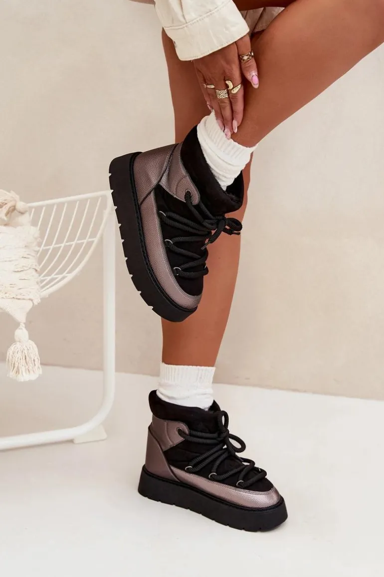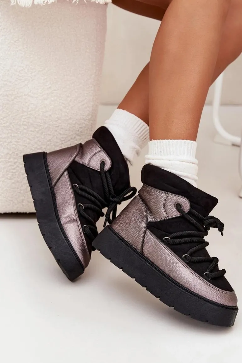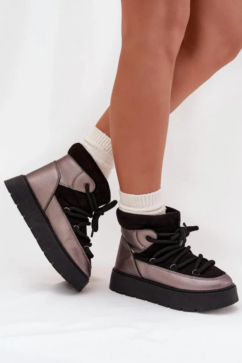 Damskie niskie śniegowce wykonane z połączenia eko zamszu i eko skóry to świetny wybór na zimowe dni. Osadzone na platformie, zapewniają komfort i stabilność, a grube wiązanie z przodu dodaje im charakteru. Środek ocieplony grubym futerkiem gwarantuje ciepło nawet w najbardziej mroźne dni. Idealne na zimowe wyjazdy, spacery czy codzienne stylizacje, te śniegowce łączą funkcjonalność z modnym wyglądem. Przy wyborze rozmiaru prosimy sugerować się tabelą rozmiarów.