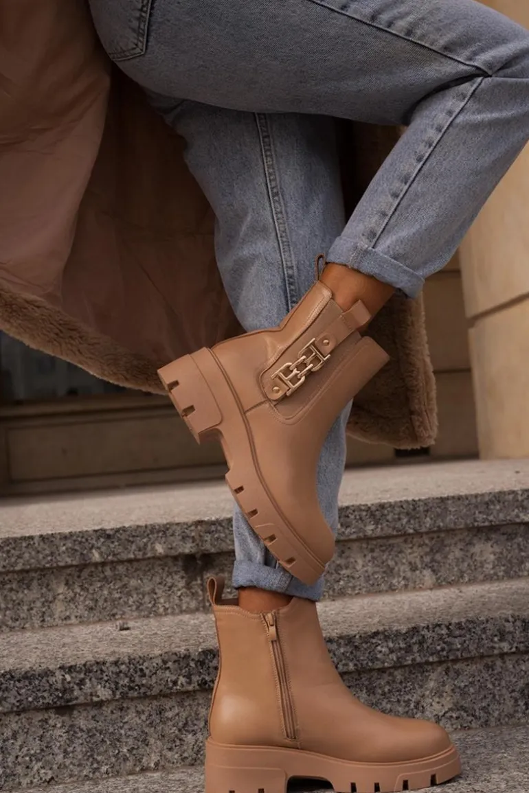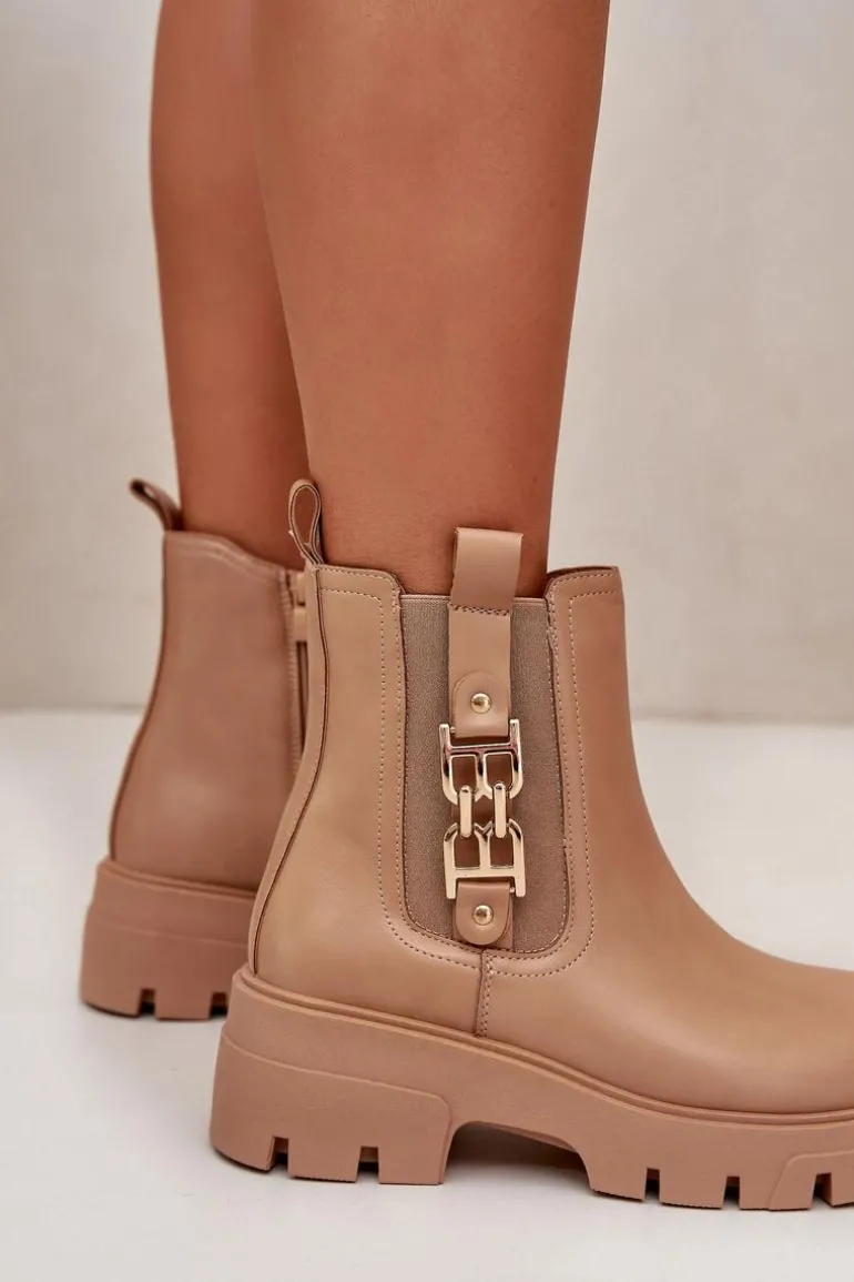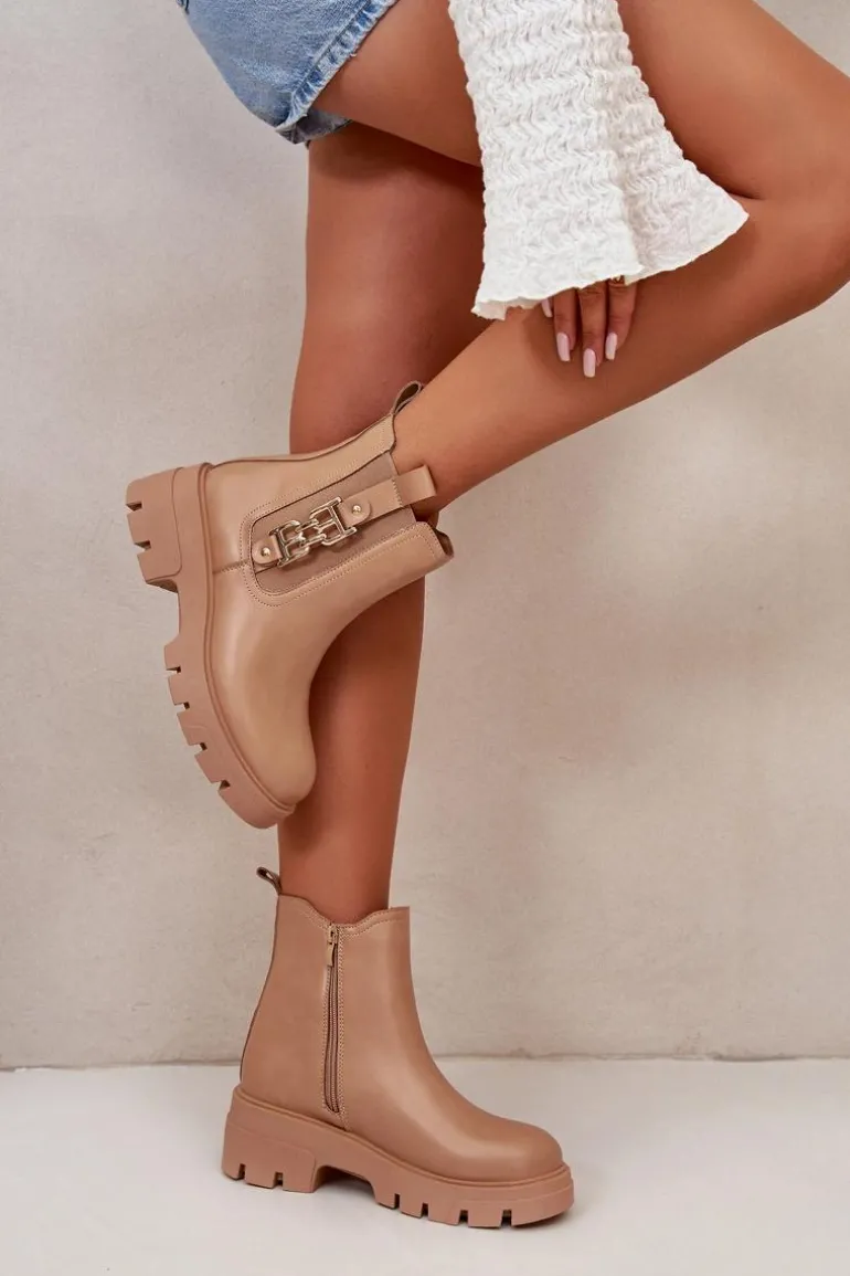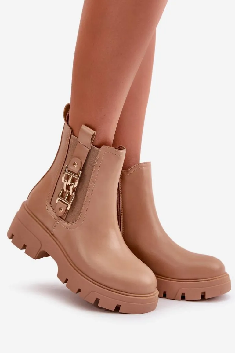 Ocieplane Botki Damskie Eko Skórzane Ze Złotą Ozdobą Beżowe Erivianes