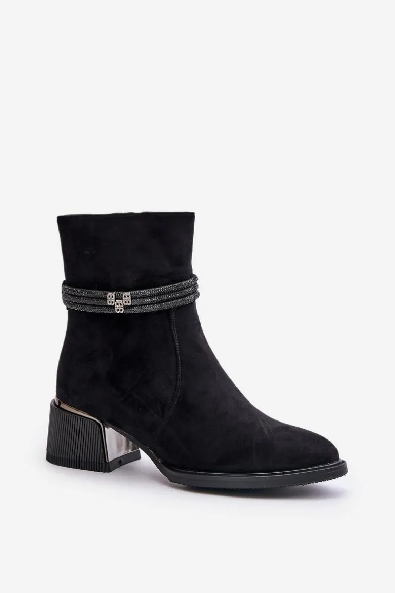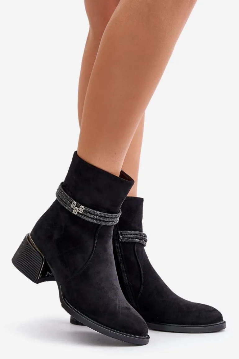 Botki damskie wykonane z wysokiej jakości eko zamszu. Osadzone na niskim obcasie. Noski w migdał. Środek ocieplany kocem obuwniczym. Zapinane na zamek. Głównym atutem tego modelu są błyszczące paseczki na cholewce. Przy wyborze rozmiaru prosimy sugerować się tabelą rozmiarów.