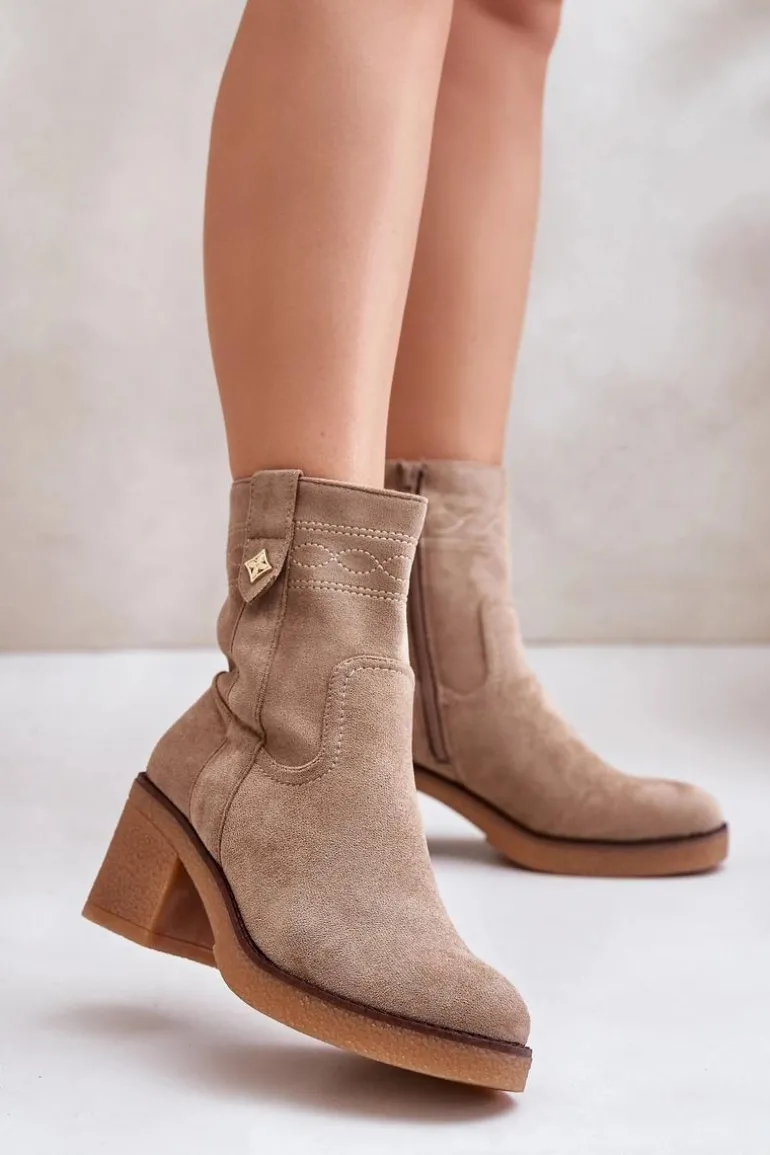 Klasyczne botki damskie wykonane z eko zamszu. Osadzone na obcasie w formie słupka. Noski zaokrąglone. Model ten wyróżnia się przeszyciami na cholewce oraz małym detalem. Wnętrze ocieplane miękkim kocem obuwniczym, idealne na chłodniejsze dni. Przy wyborze rozmiaru prosimy sugerować się tabelą rozmiarów.