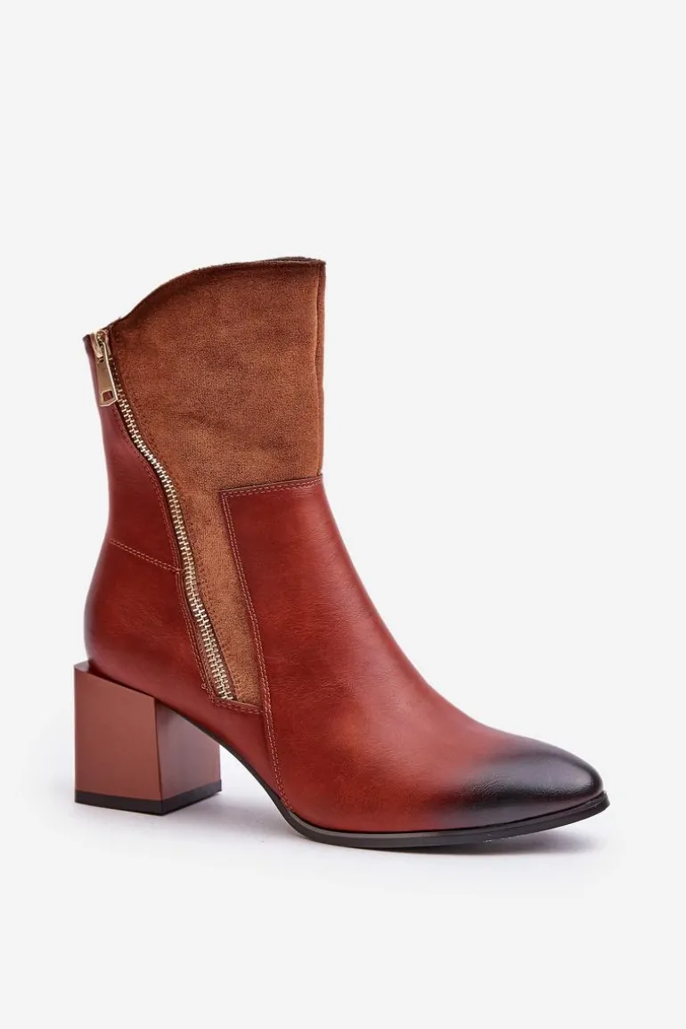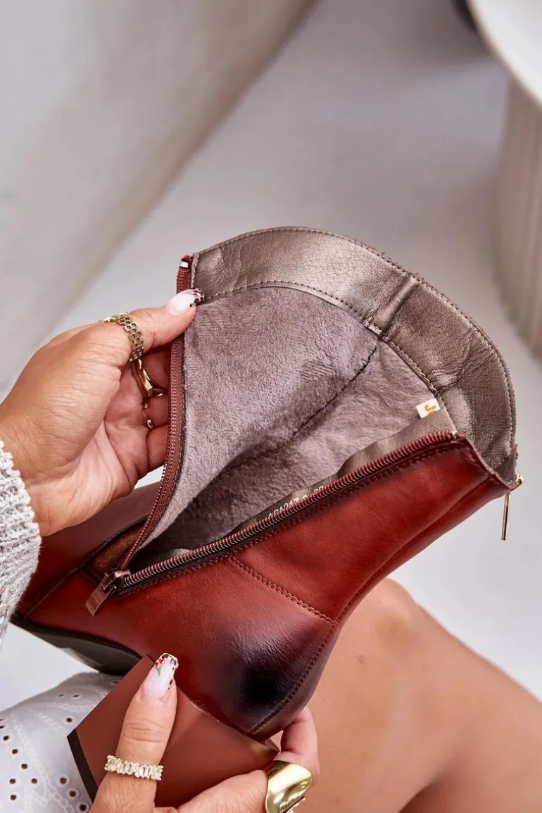 Damskie botki wykonane z eko skóry, osadzone na stabilnym obcasie typu słupek. Zapinane na zamek, z dodatkowym ozdobnym suwakiem, który dodaje charakteru. Wnętrze ocieplone kocem obuwniczym, zapewniającym ciepło i wygodę w chłodniejsze dni. Idealny wybór dla kobiet ceniących styl i komfort. Przy wyborze rozmiaru prosimy sugerować się tabelą rozmiarów.