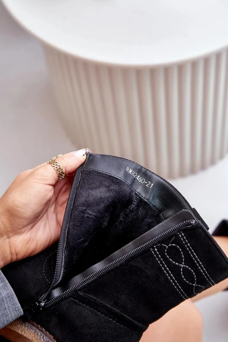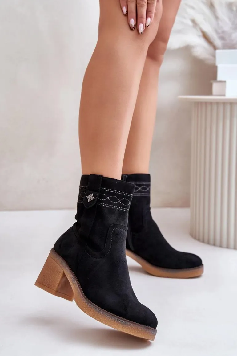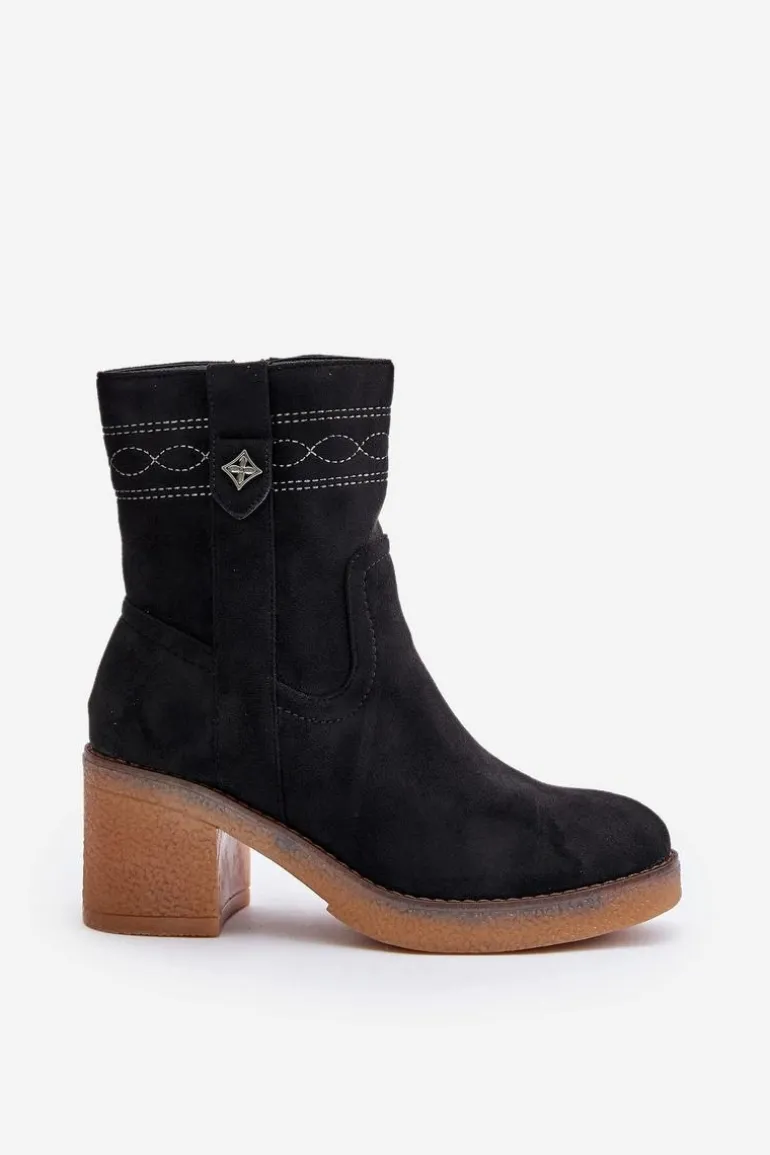Klasyczne botki damskie wykonane z eko zamszu. Osadzone na obcasie w formie słupka. Noski zaokrąglone. Model ten wyróżnia się przeszyciami na cholewce oraz małym detalem. Wnętrze ocieplane miękkim kocem obuwniczym, idealne na chłodniejsze dni. Przy wyborze rozmiaru prosimy sugerować się tabelą rozmiarów.