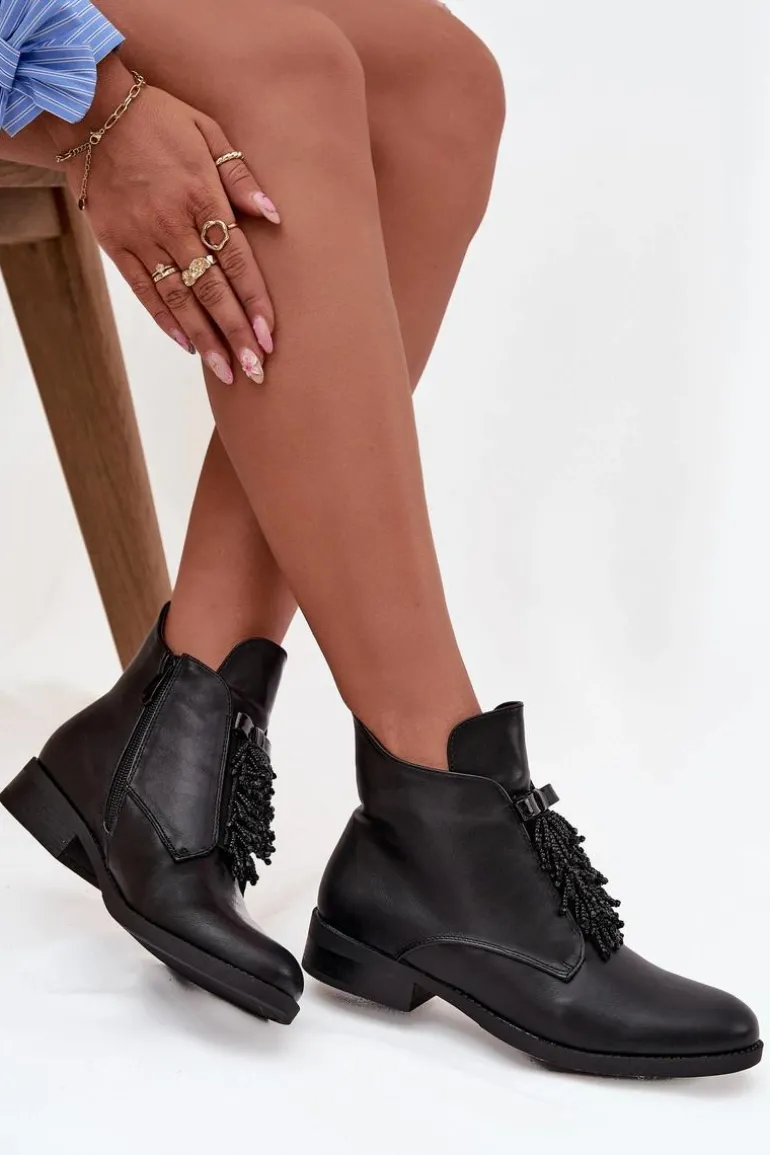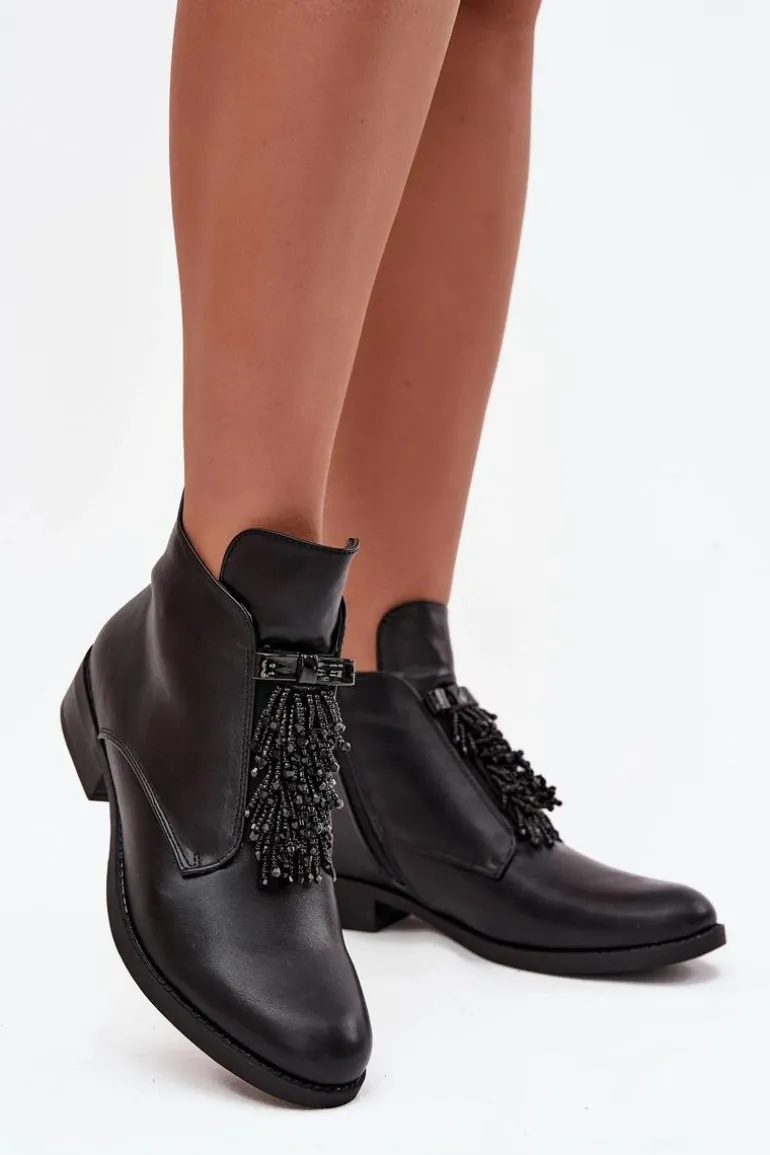 Botki damskie od marki S.Barski to propozycja łącząca wygodę z modnym, oryginalnym akcentem. Wykonane z wysokiej jakości eko skóry prezentują się elegancko, a jednocześnie są trwałe. Model osadzono na płaskim obcasie, co gwarantuje komfort i swobodę podczas codziennego użytkowania. Wnętrze zostało ocieplone miękkim materiałem, dzięki czemu buty doskonale sprawdzą się w chłodniejsze dni, zapewniając ciepło i wygodę. Uwagę przyciąga ozdobny detal z przodu w formie koralików, który dodaje całości wyjątkowego, kobiecego charakteru. Zapięcie na zamek ułatwia zakładanie i zdejmowanie obuwia. Świetnie sprawdzą się w stylizacjach z sukienkami, spódnicami i spodniami. Przy wyborze rozmiaru prosimy sugerować się tabelą rozmiarów.