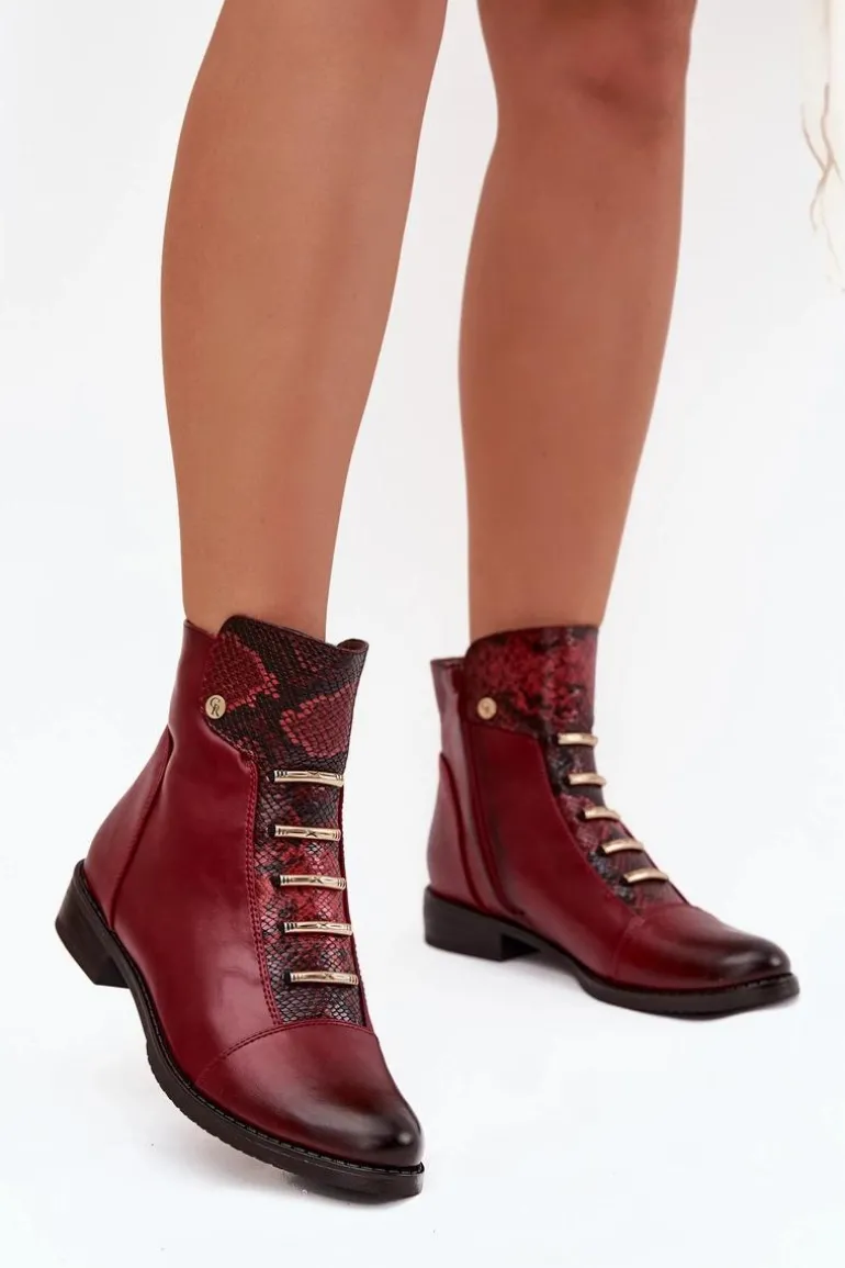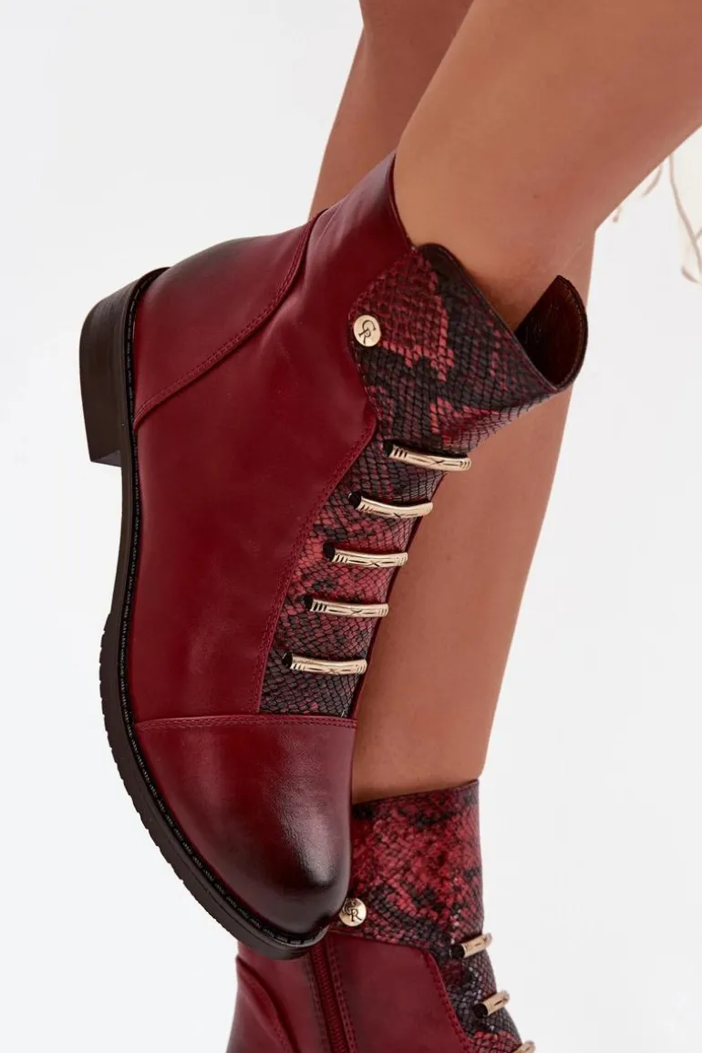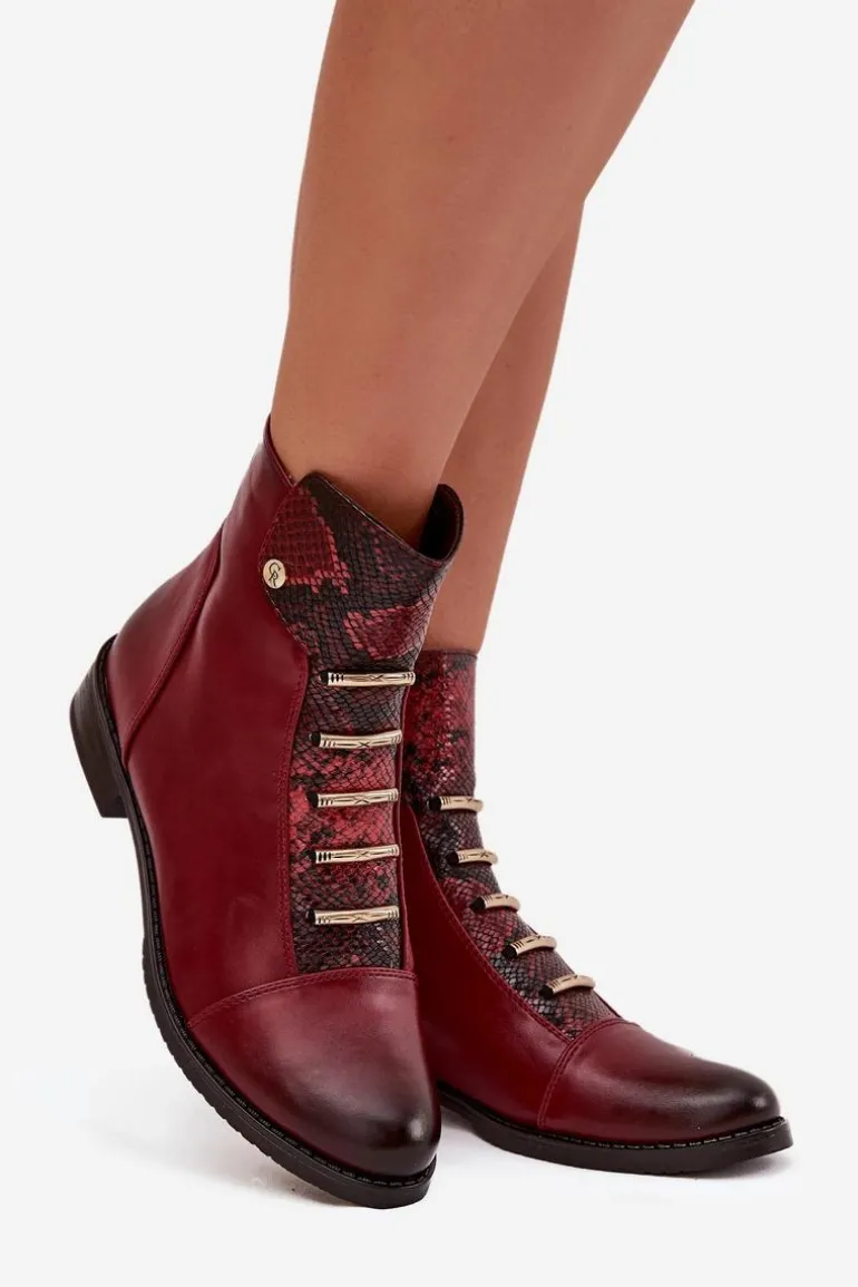 Ocieplane Botki Damskie Na Płaskim Obcasie Zwierzęcy Wzór Bordowe Labise