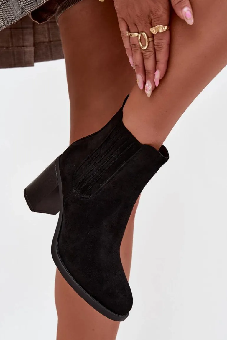Botki damskie z eko zamszu to ponadczasowa propozycja na chłodniejsze dni. Osadzone na stabilnym obcasie typu słupek zapewniają wygodę i subtelnie podkreślają sylwetkę. Wnętrze zostało ocieplone kocem obuwniczym. Dzięki swojemu klasycznemu fasonowi buty doskonale pasują zarówno do codziennych, jak i eleganckich stylizacji – idealne do spodni, spódnic czy sukienek.