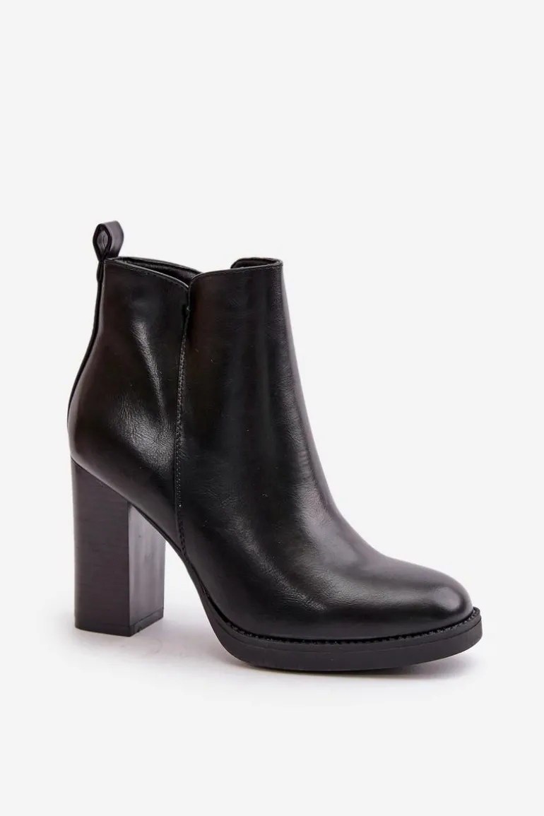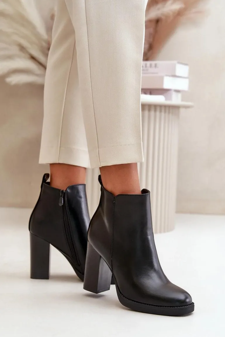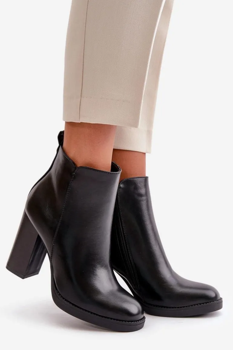 Damskie botki wykonane z eko skóry. Osadzone na słupkowym obcasie. Zapinane na zamek. Środek ocieplony kocem obuwniczym, co sprawia, że model ten świetnie sprawdzi się w chłodniejsze dni. Noski zaokrąglone. Klasyczny fason, który z pewnością dopasujesz do wielu stylizacji! Przy wyborze rozmiaru prosimy sugerować się tabelą rozmiarów.