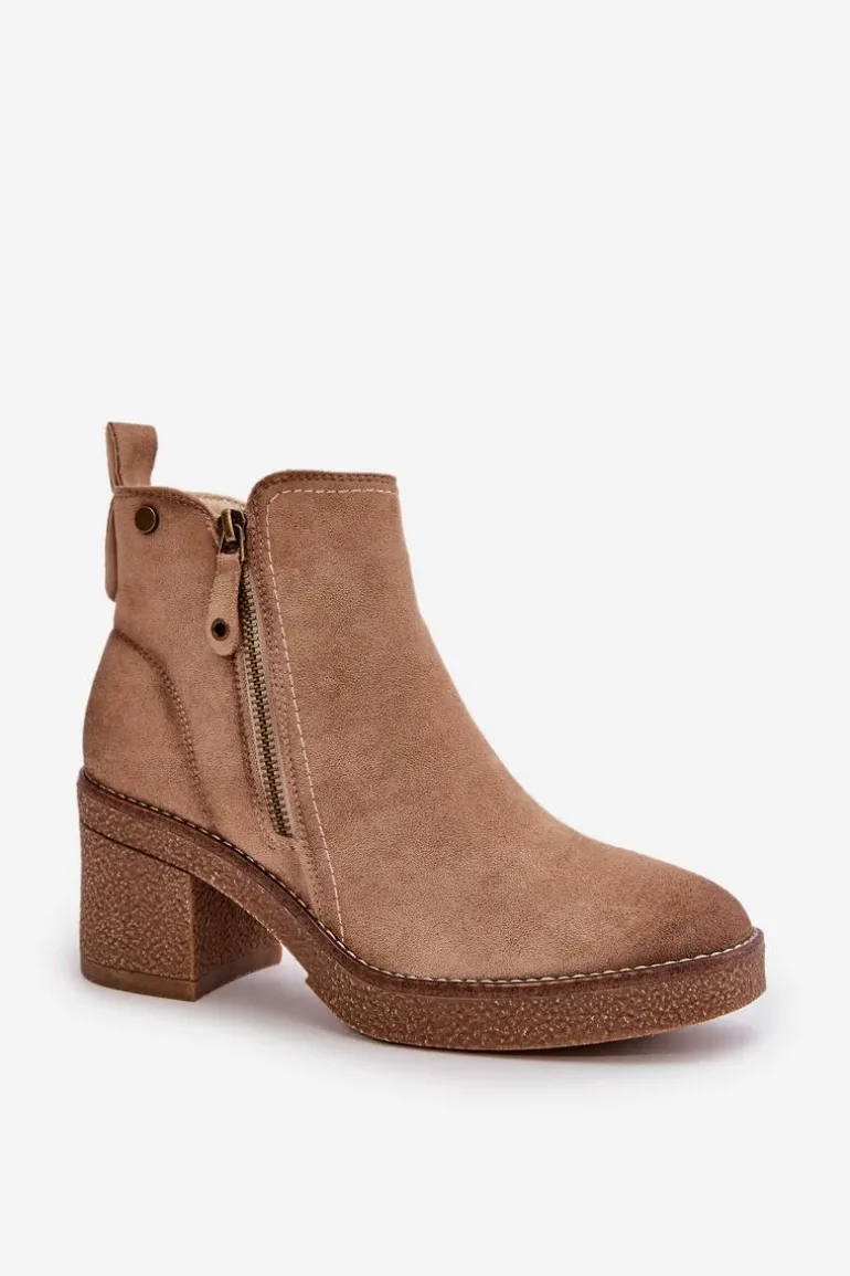 Damskie botki wykonane z miękkiego eko zamszu. Osadzone na stabilnym obcasie słupku. Wnętrze ocieplone kocem obuwniczym, co zapewnia ciepło i komfort noszenia. Model ten posiada zaokrąglone noski i jest zapinany na zamek, co ułatwia zakładanie i zdejmowanie. Idealne do jesiennych i zimowych stylizacji. Przy wyborze rozmiaru prosimy sugerować się tabelą rozmiarów.