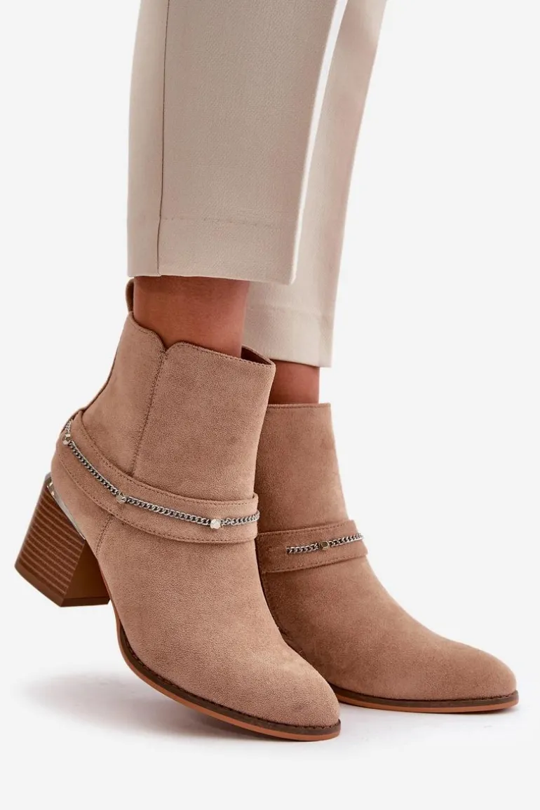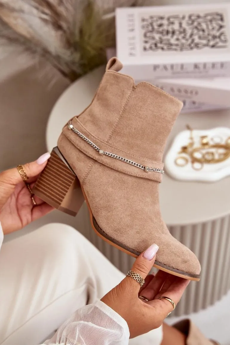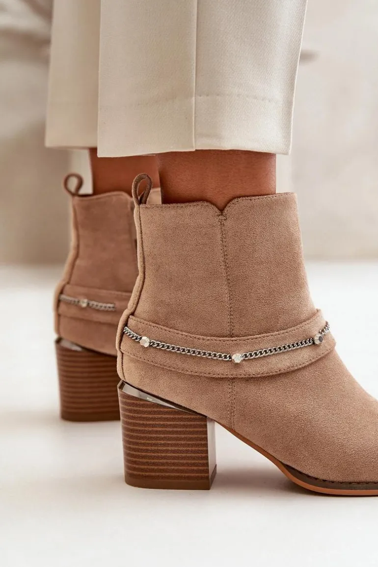 Botki z eko zamszu na obcasie w formie słupka to stylowy wybór na chłodniejsze dni. Cholewka ozdobiona łańcuszkiem dodaje charakteru i wyrazistości. Zapięcie na zamek ułatwia zakładanie i zdejmowanie, a ocieplone wnętrze z koca obuwniczego zapewnia ciepło i komfort. Idealne na jesienne i zimowe stylizacje, te botki łączą w sobie modny wygląd i wygodę noszenia.Przy wyborze rozmiaru prosimy sugerować się tabelą rozmiarów.