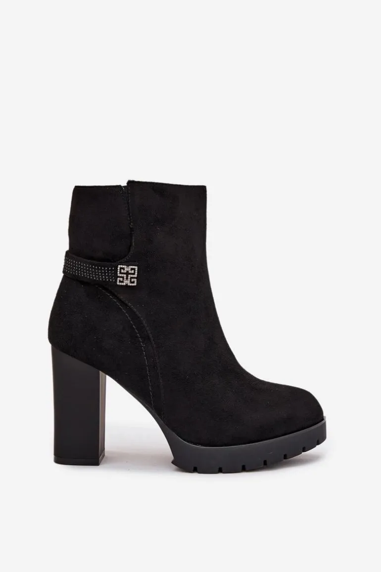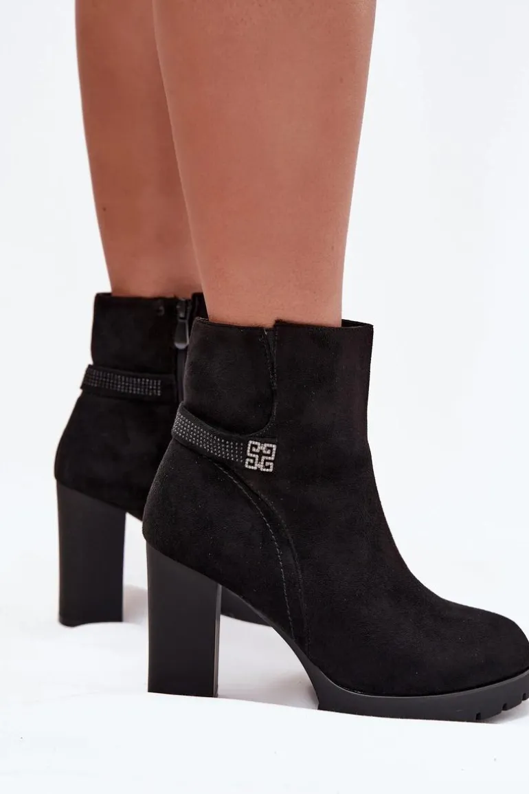 Damskie botki z eko zamszu to elegancka propozycja na chłodniejsze dni. Osadzone na obcasie typu słupek. Wnętrze jest ocieplane, co gwarantuje ciepło w chłodniejsze dni. Zamek błyskawiczny ułatwia zakładanie, a ozdobny paseczek na cholewce dodaje modnego akcentu. Te botki doskonale komponują się z różnorodnymi stylizacjami, łącząc elegancję z funkcjonalnością. Przy wyborze rozmiaru prosimy sugerować się tabelą rozmiarów.