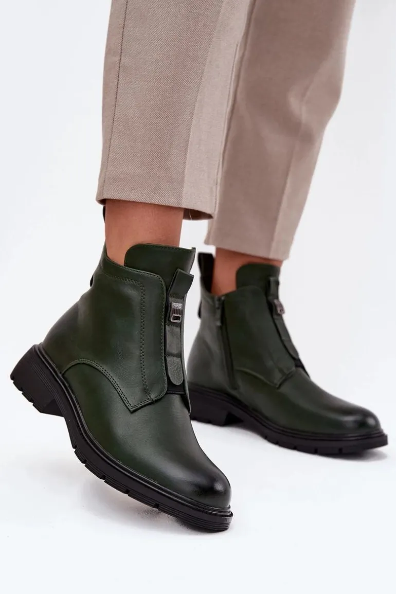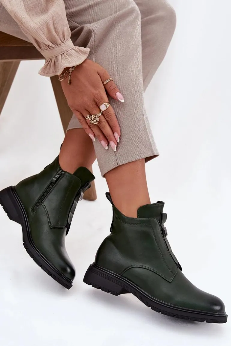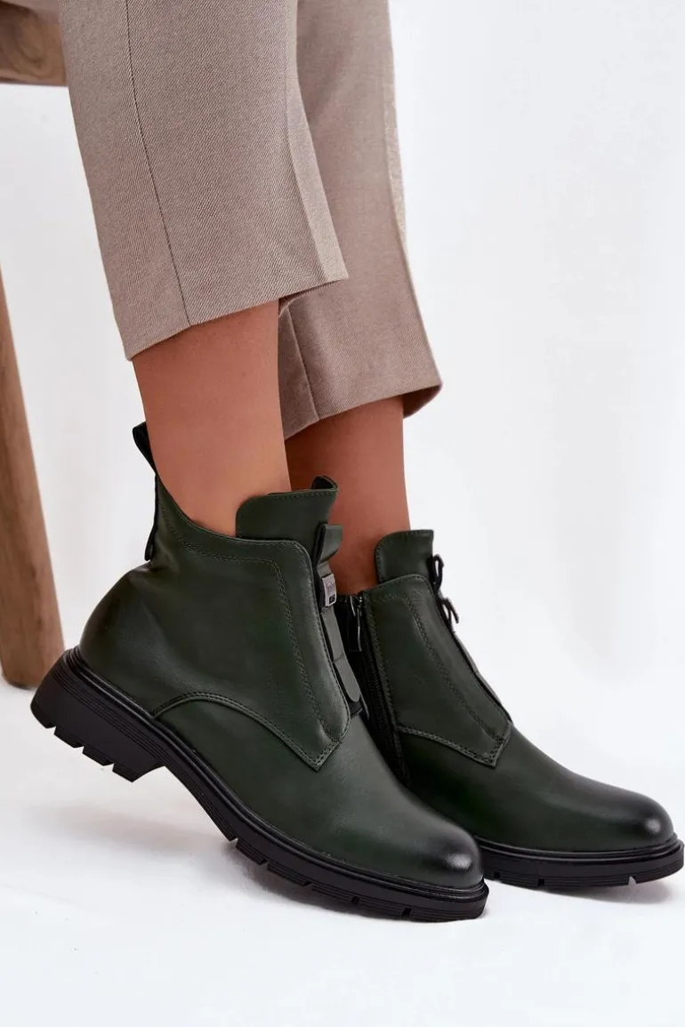 Botki damskie od marki Jezzi to praktyczne połączenie wygody i stylu na chłodniejsze dni. Wykonane z wysokiej jakości eko skóry, prezentują elegancki wygląd przy zachowaniu trwałości i łatwości w utrzymaniu. Osadzone na płaskim obcasie, zapewniają stabilny krok i komfort podczas codziennego noszenia. Model jest zapinany na zamek, co ułatwia szybkie zakładanie i dopasowanie do stopy. Wnętrze ocieplone, gwarantuje ciepło w chłodne dni, a subtelny, ozdobny detal z przodu cholewki dodaje charakteru i modnego akcentu, który wyróżnia je w codziennych stylizacjach. Idealne do casualowych zestawów, jak i do nieco bardziej eleganckich outfitów. Przy wyborze rozmiaru prosimy sugerować się tabelą rozmiarów.