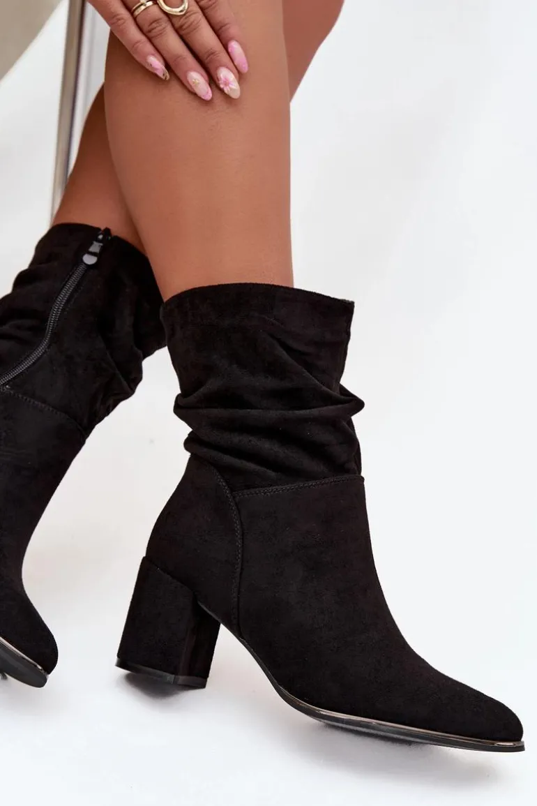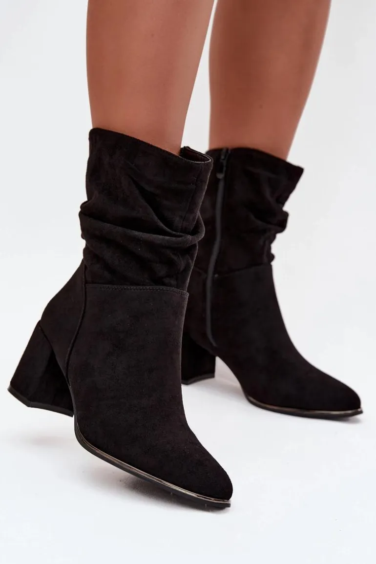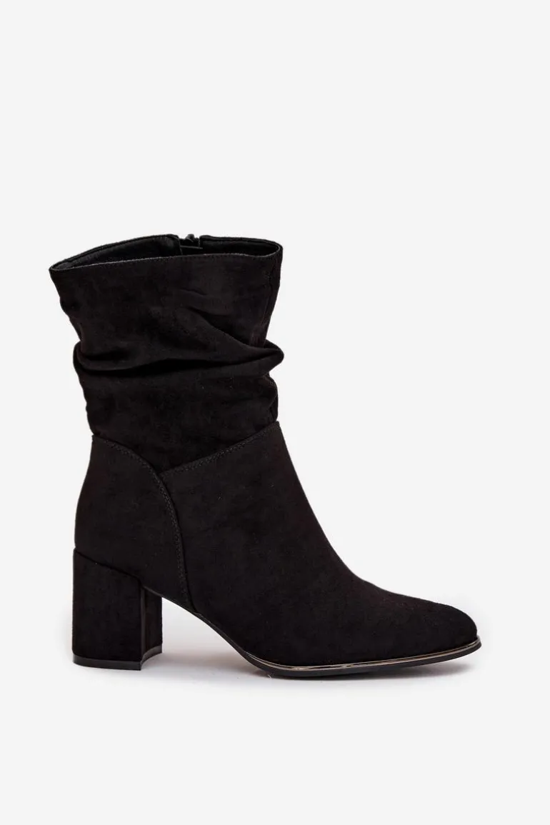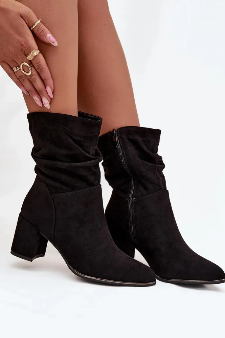 Botki damskie z eko zamszu to stylowa propozycja na chłodniejsze dni. Osadzone na stabilnym obcasie typu słupek subtelnie wysmuklają sylwetkę, a zamek po boku ułatwia zakładanie i zdejmowanie. Modnego charakteru dodaje im marszczona cholewka, która przyciąga uwagę. Wnętrze butów zostało ocieplone kocem obuwniczym, dzięki czemu zapewniają komfort i ciepło w jesienne oraz zimowe dni. To uniwersalny model, który świetnie sprawdzi się zarówno w codziennych, jak i bardziej eleganckich stylizacjach.