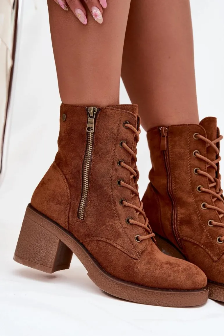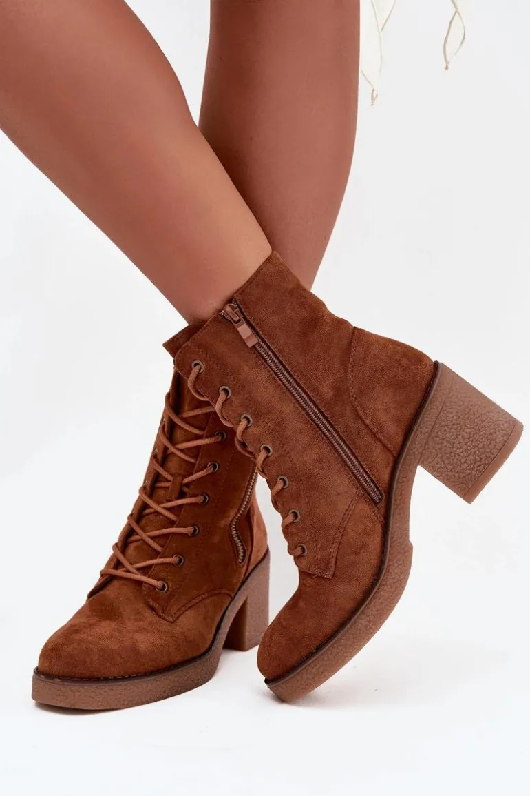 Botki damskie wykonane z eko zamszu. Osadzone na stabilnym obcasie typu słupek, subtelnie podkreślają sylwetkę, a dzięki sznurowaniu można je idealnie dopasować do stopy. Posiadają zapięcie na zamek, co ułatwia zakładanie oraz dodatkowy ozdobny suwak, który nadaje całości modnego charakteru. Wnętrze butów zostało ocieplone kocem obuwniczym, co gwarantuje komfort termiczny w chłodniejsze dni. To idealny wybór do codziennych i casualowych stylizacji.
